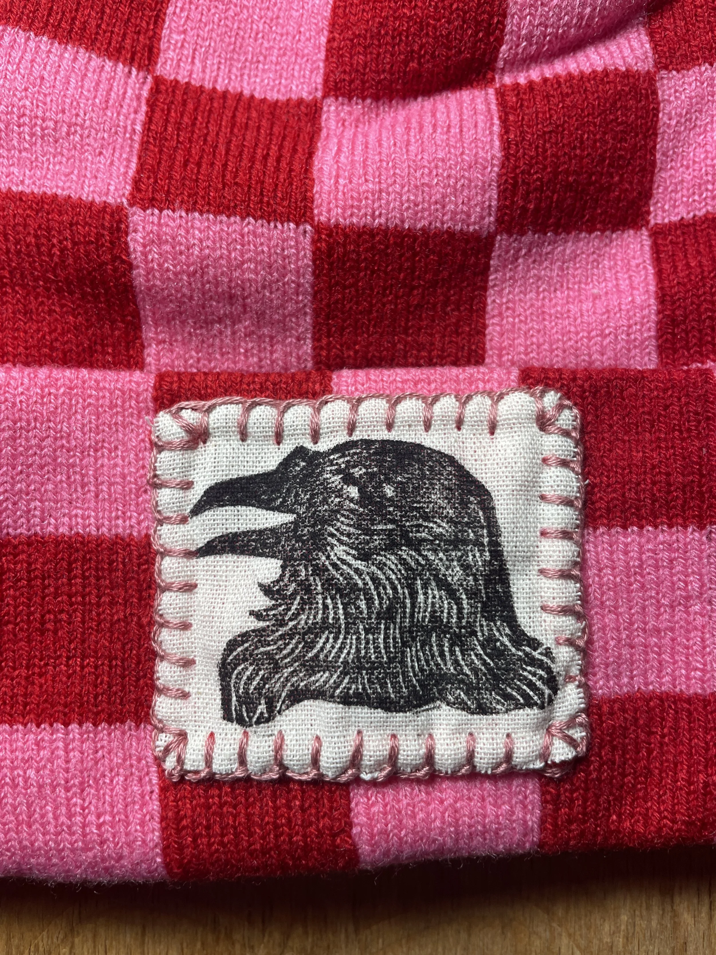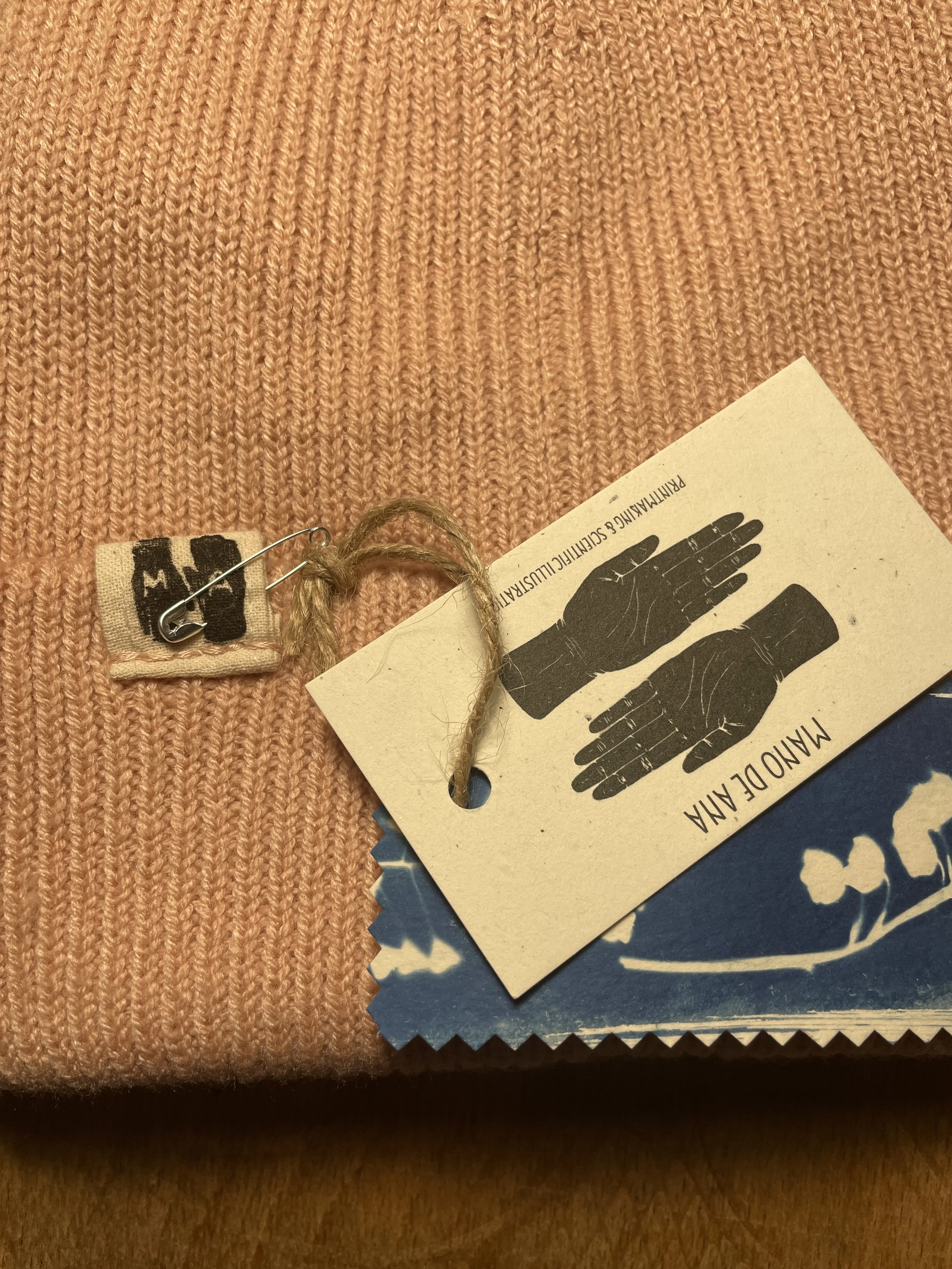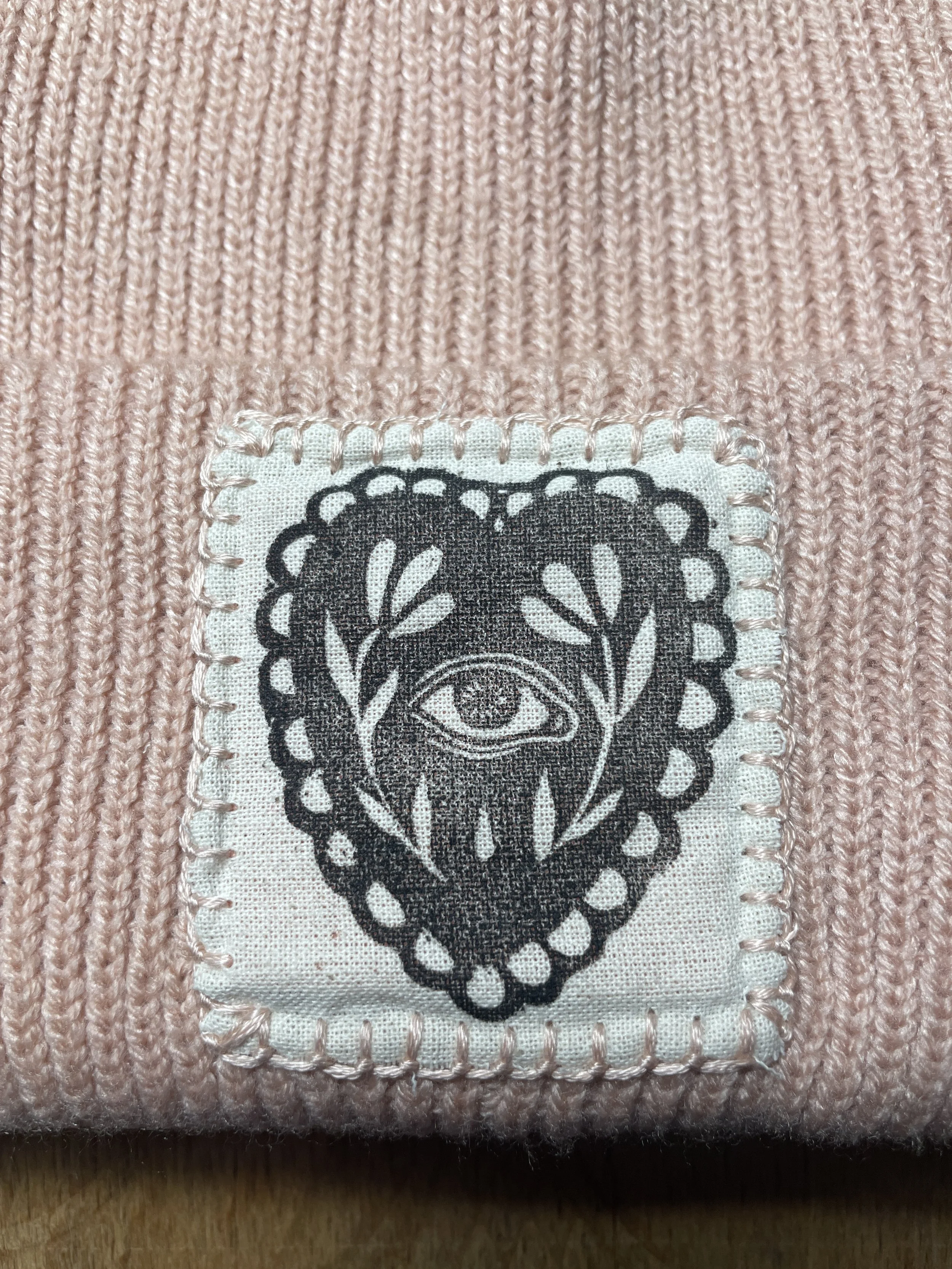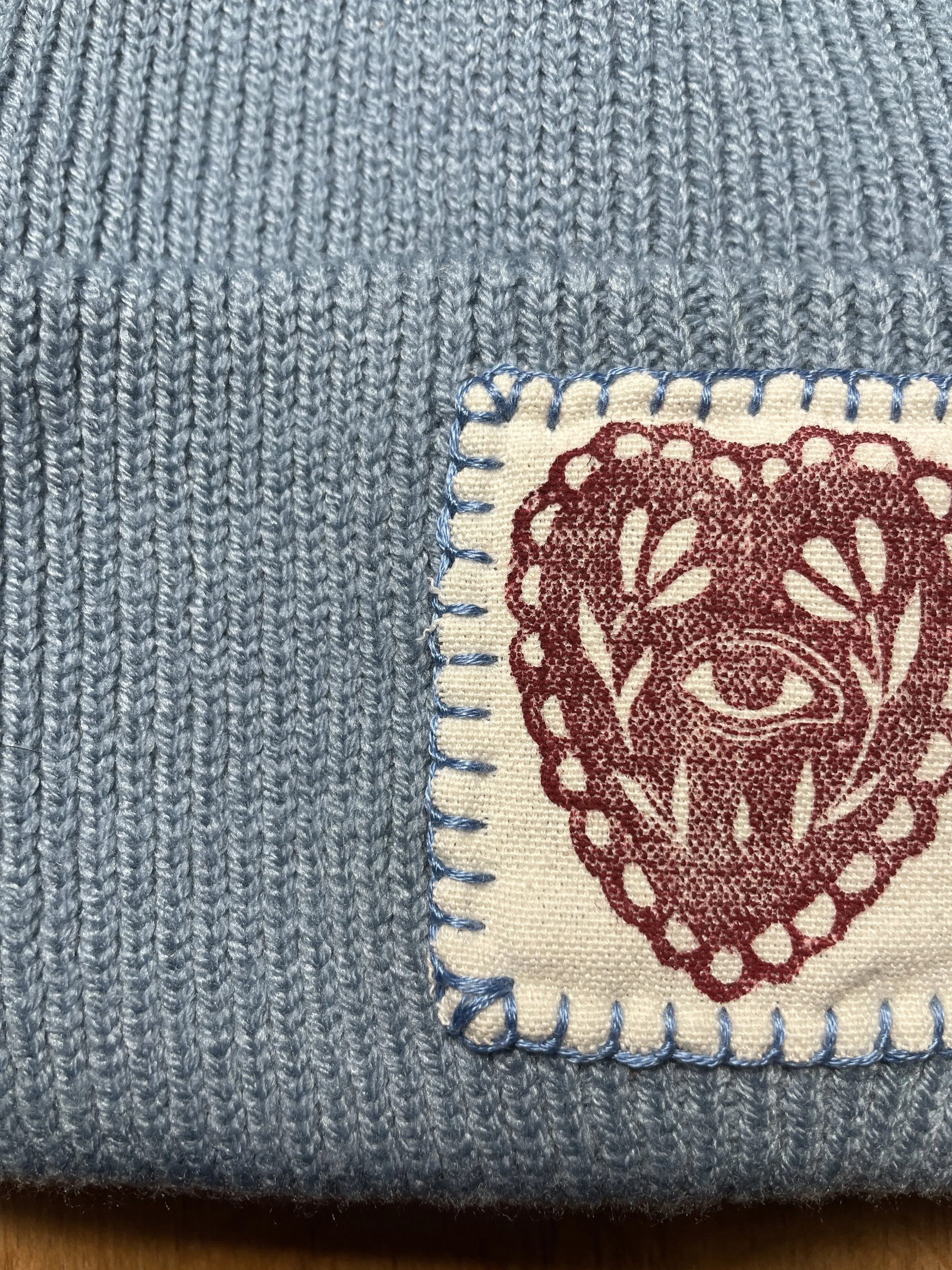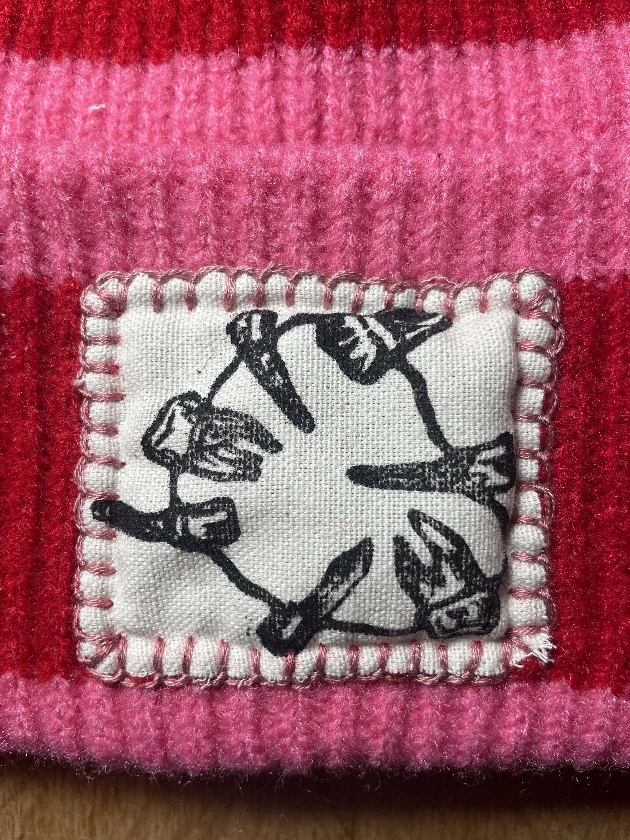A cozy warm beanie with a linocut patch printed on leftover cotton fabric, hand sewn and handprinted tag.