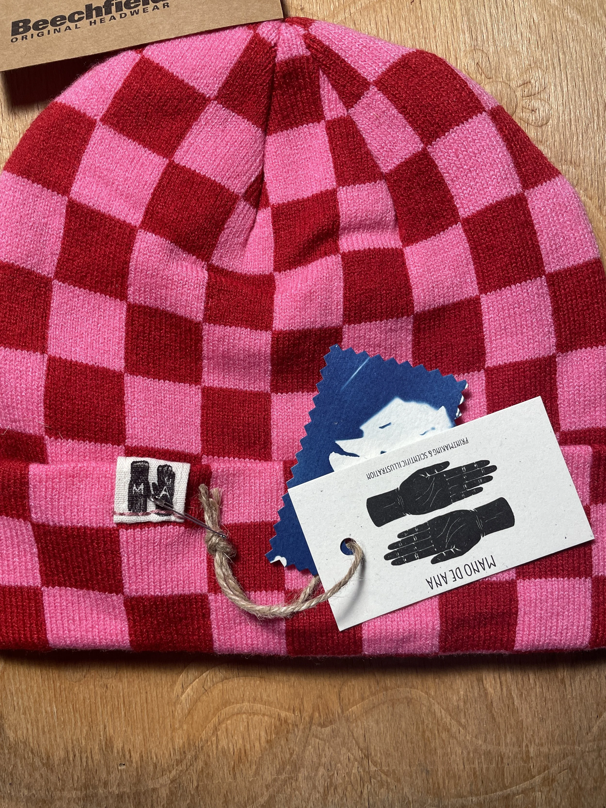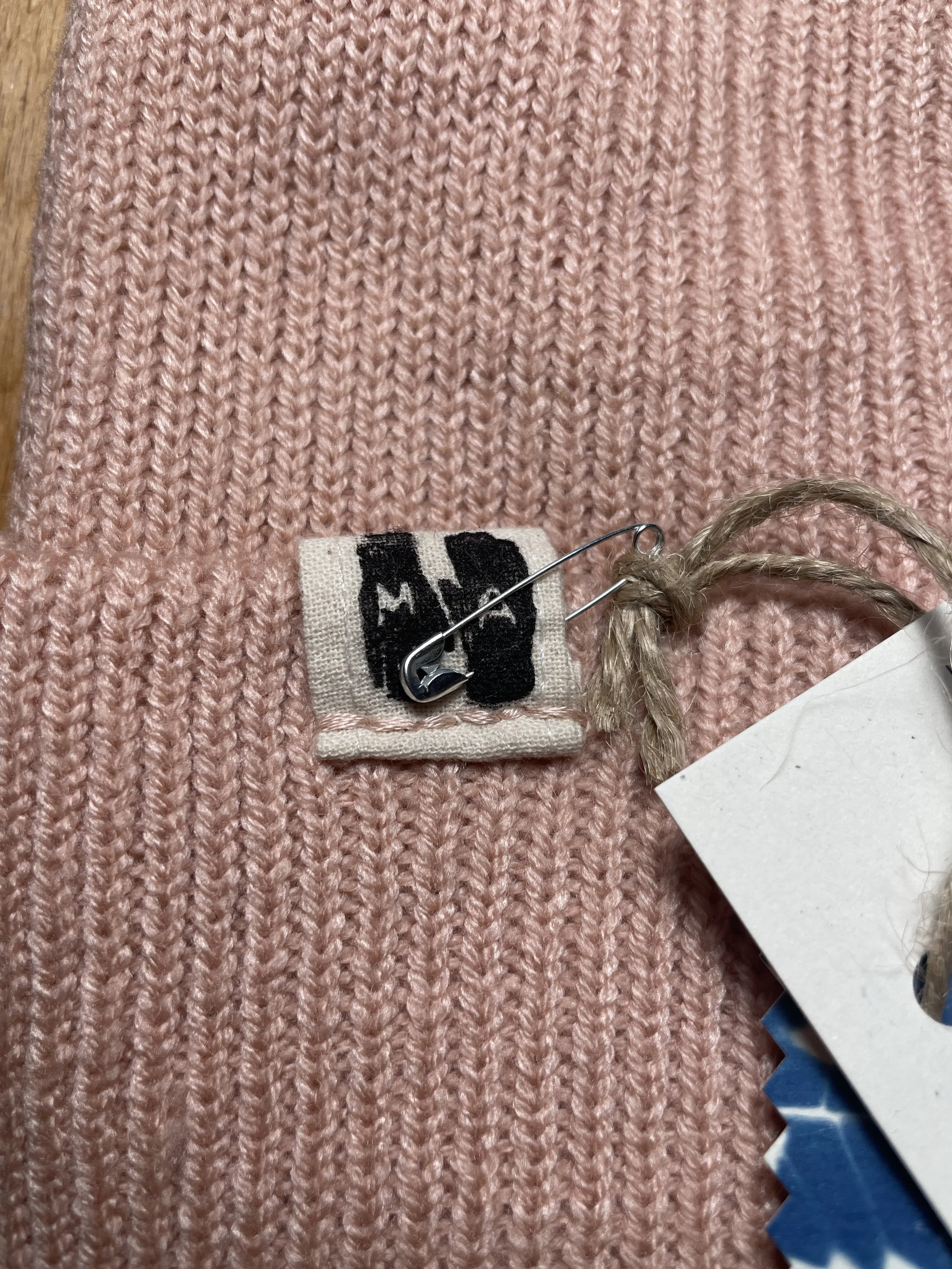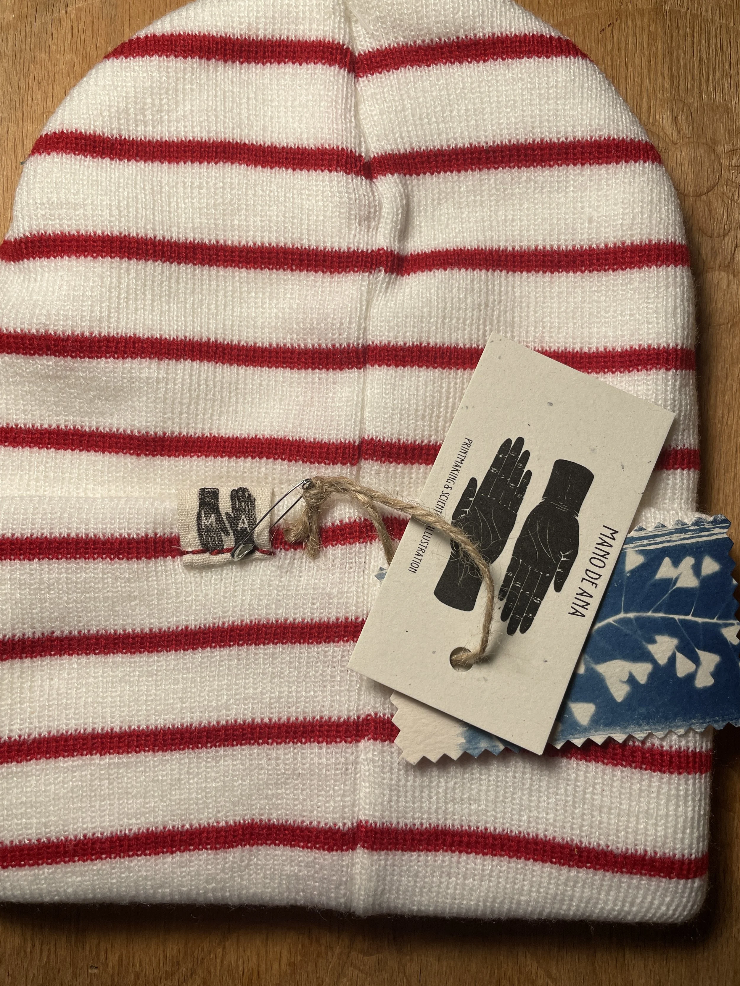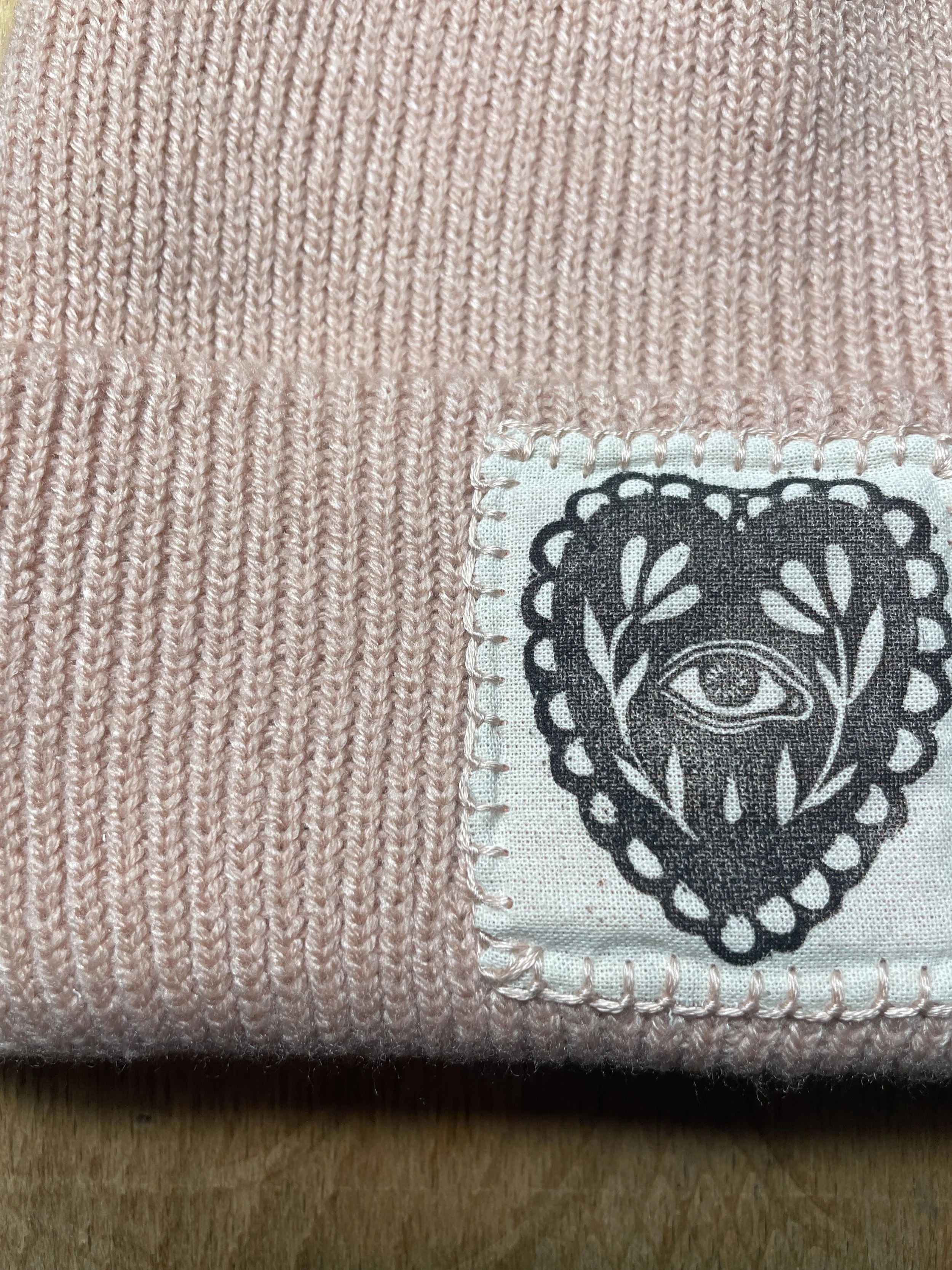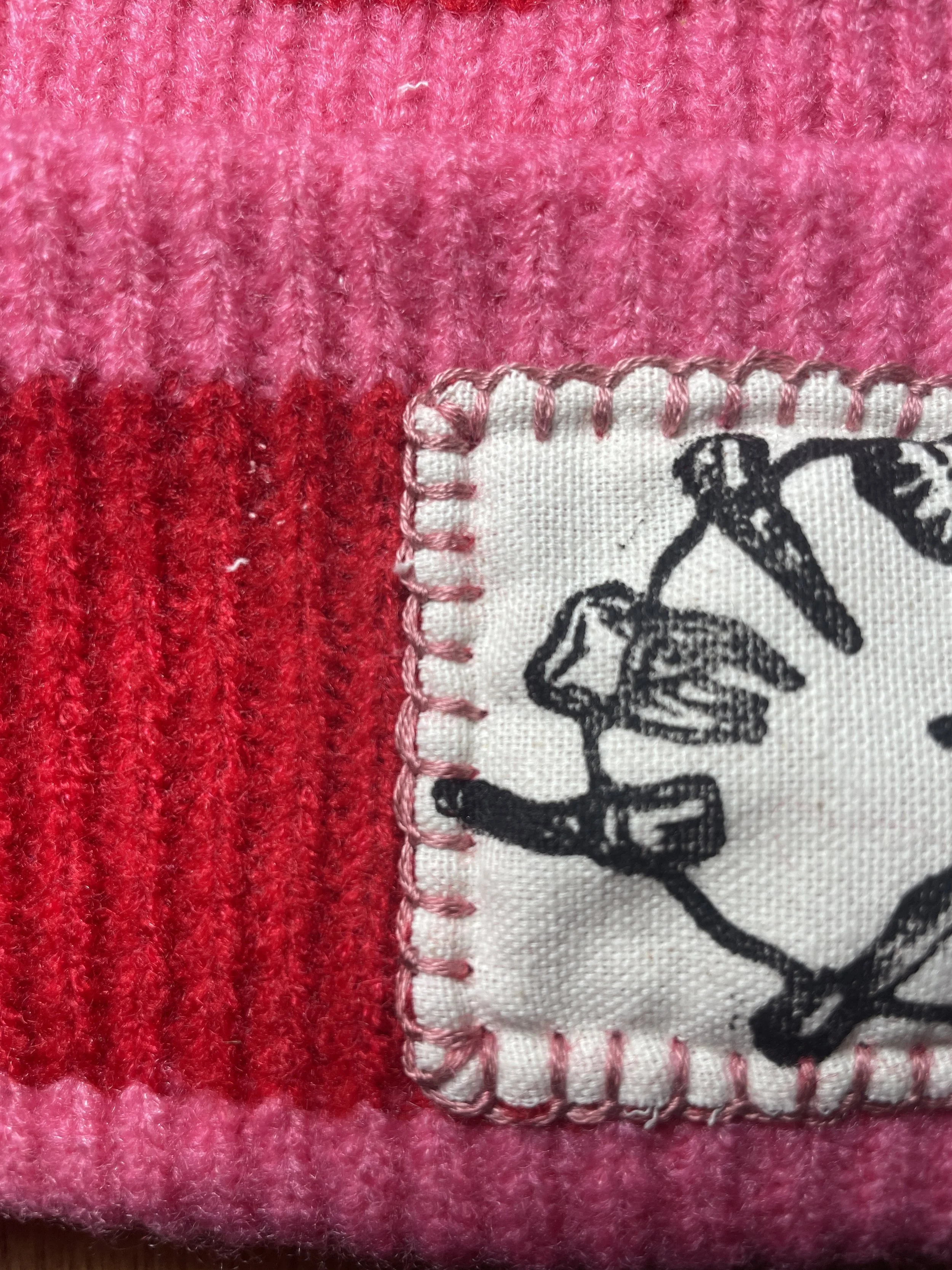 A cozy warm beanie with a linocut patch printed on leftover cotton fabric, hand sewn and handprinted tag.