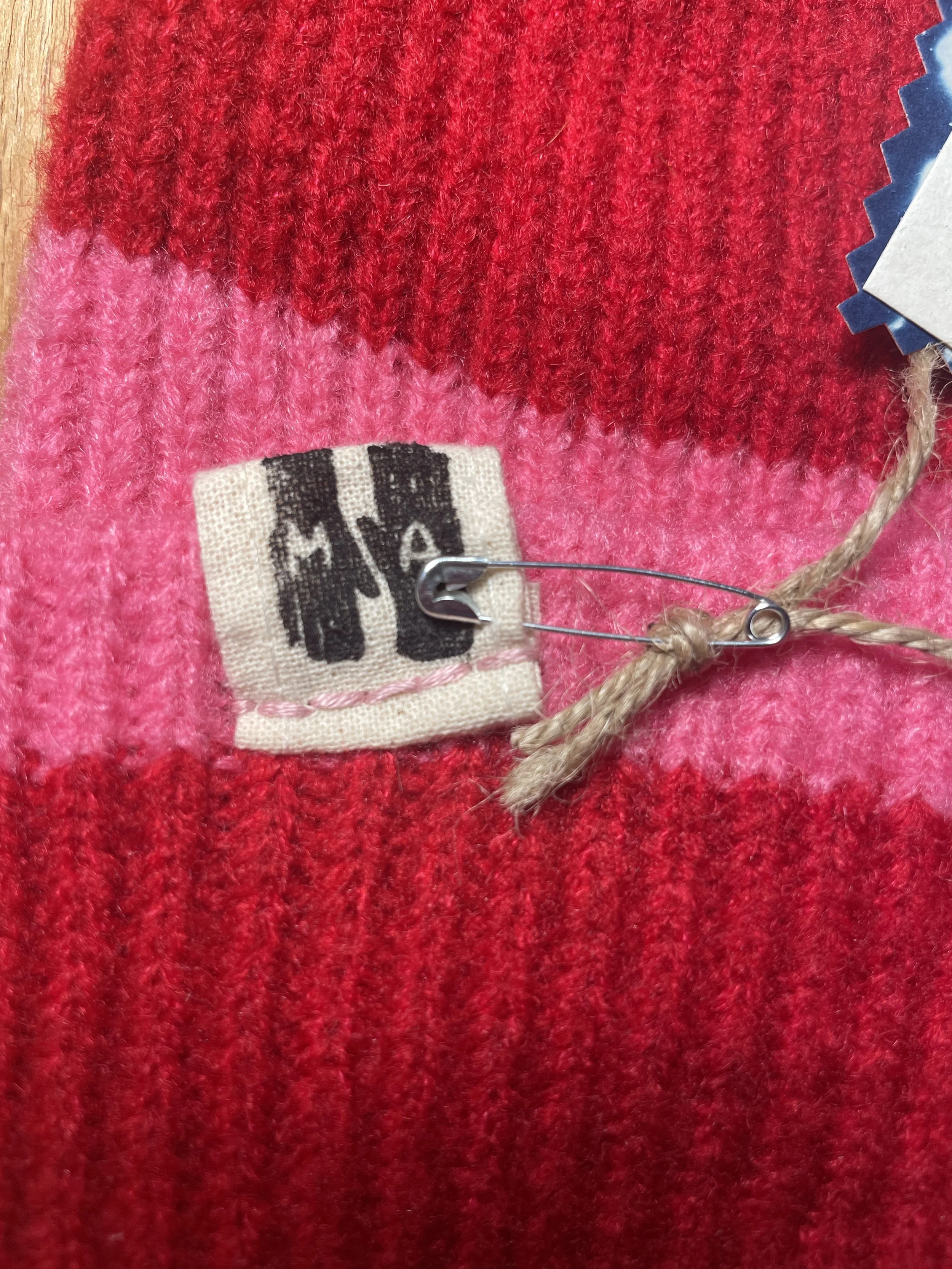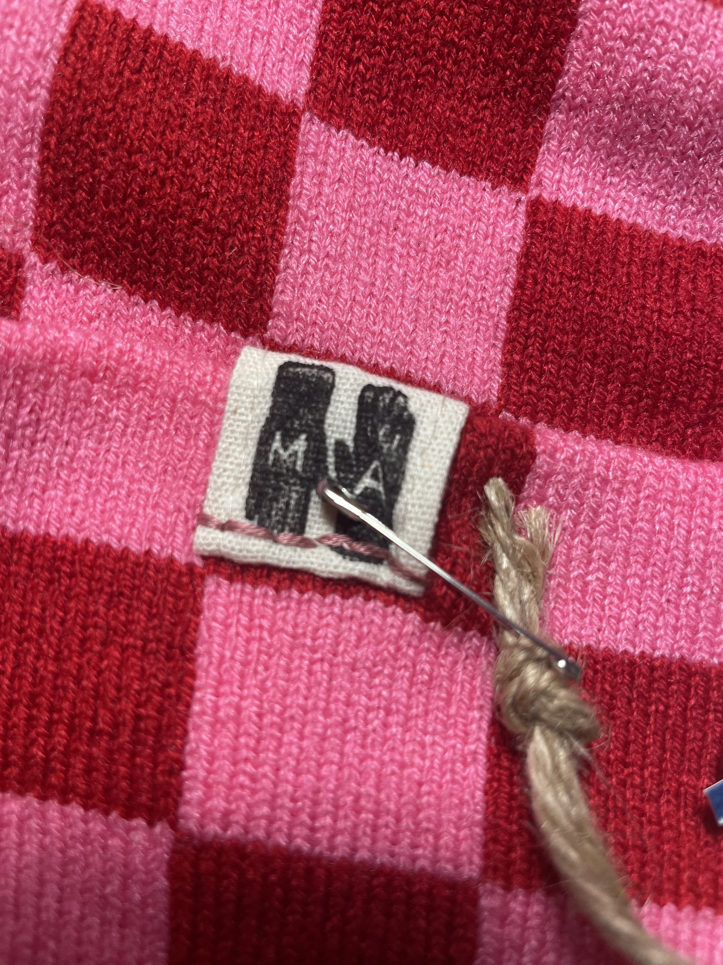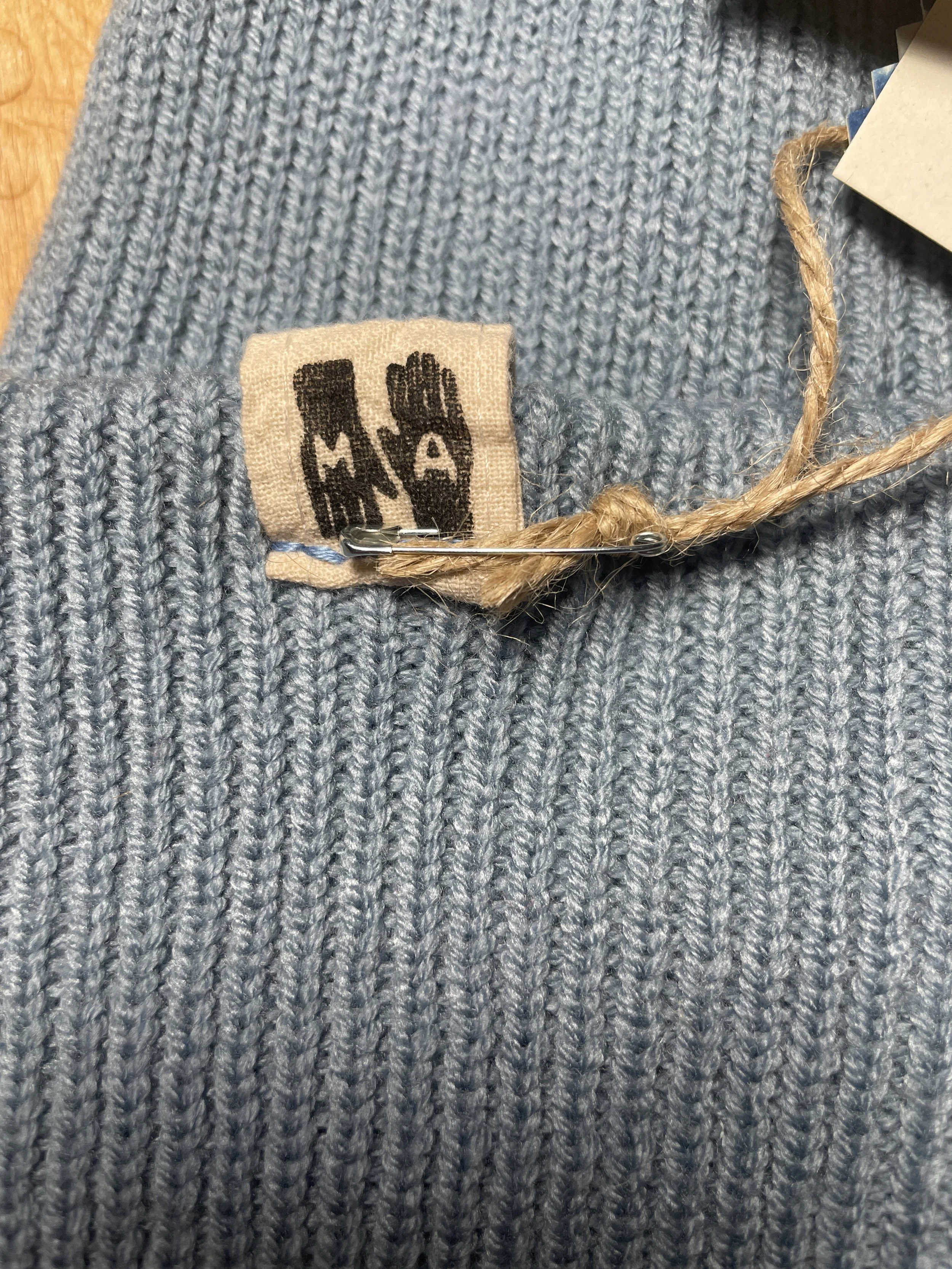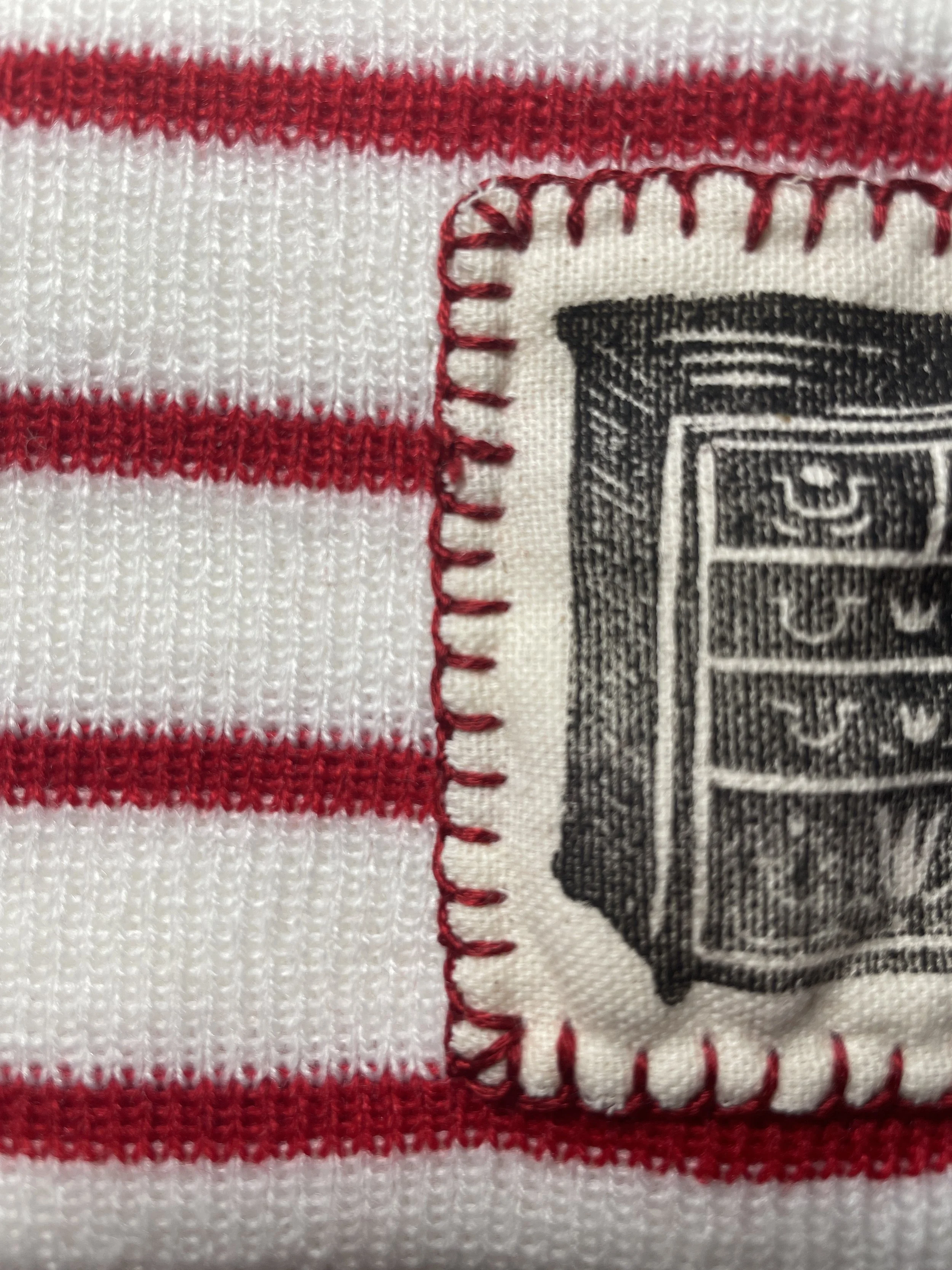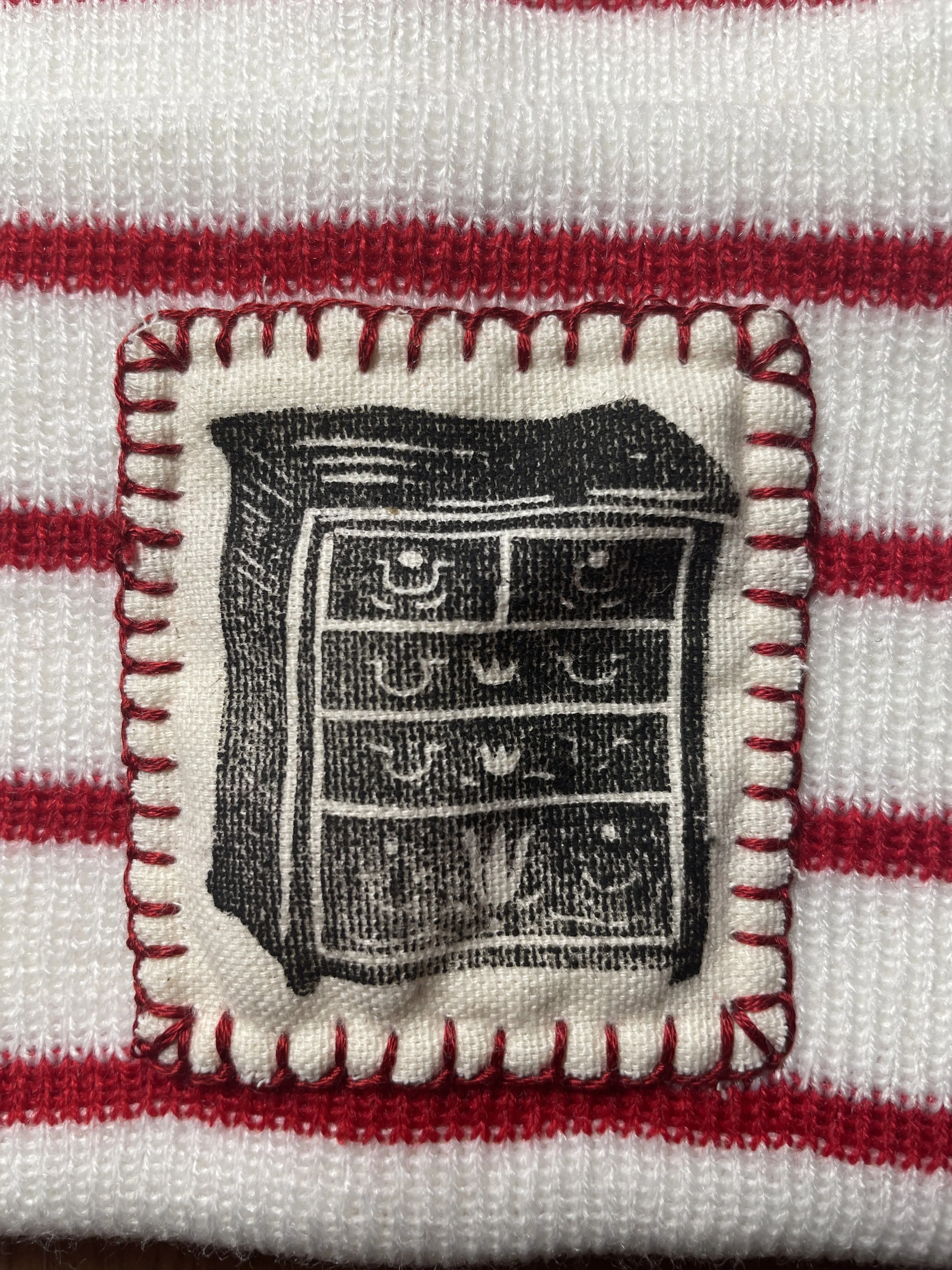 A cozy warm beanie with a linocut patch printed on leftover cotton fabric, hand sewn and handprinted tag.