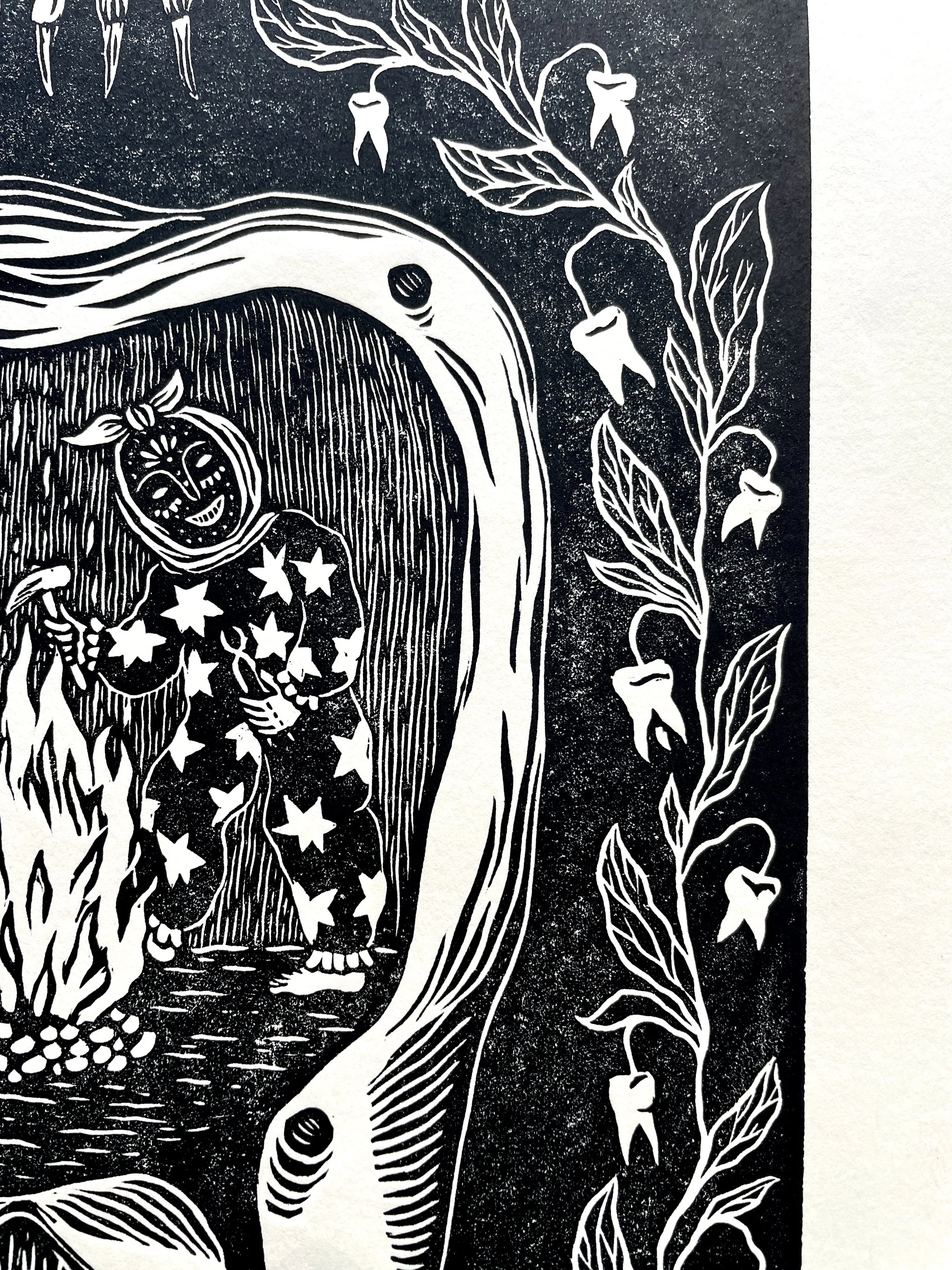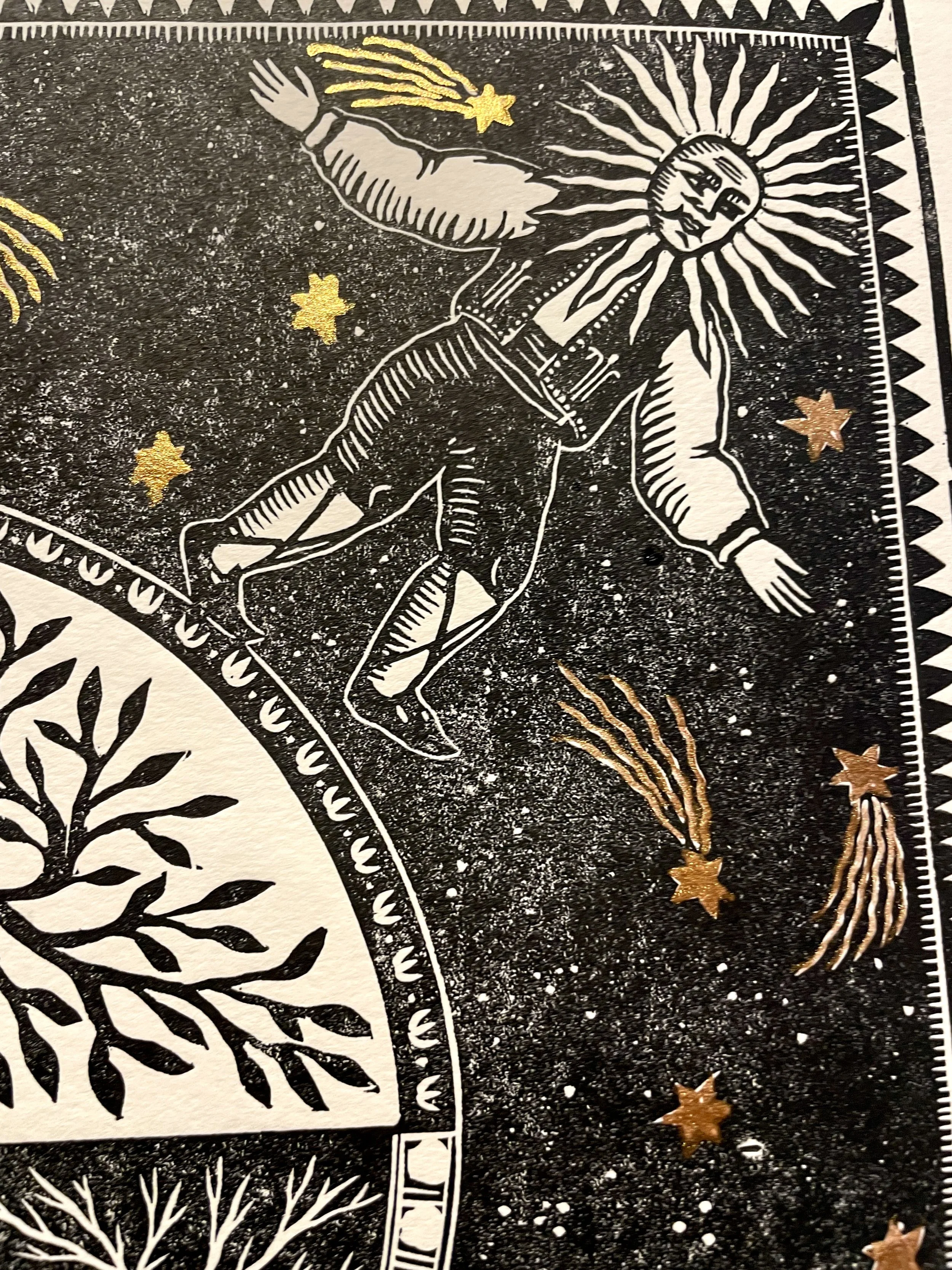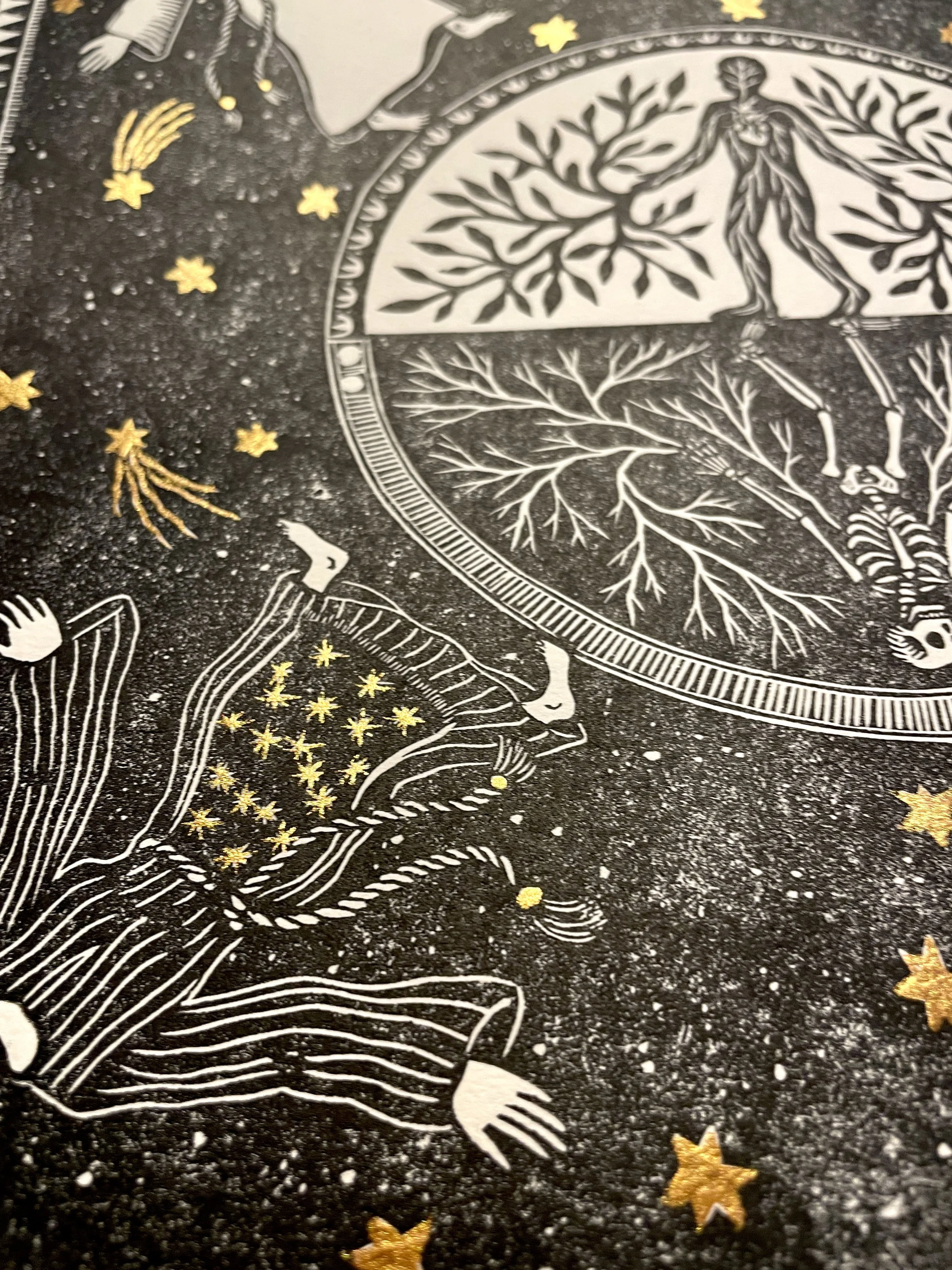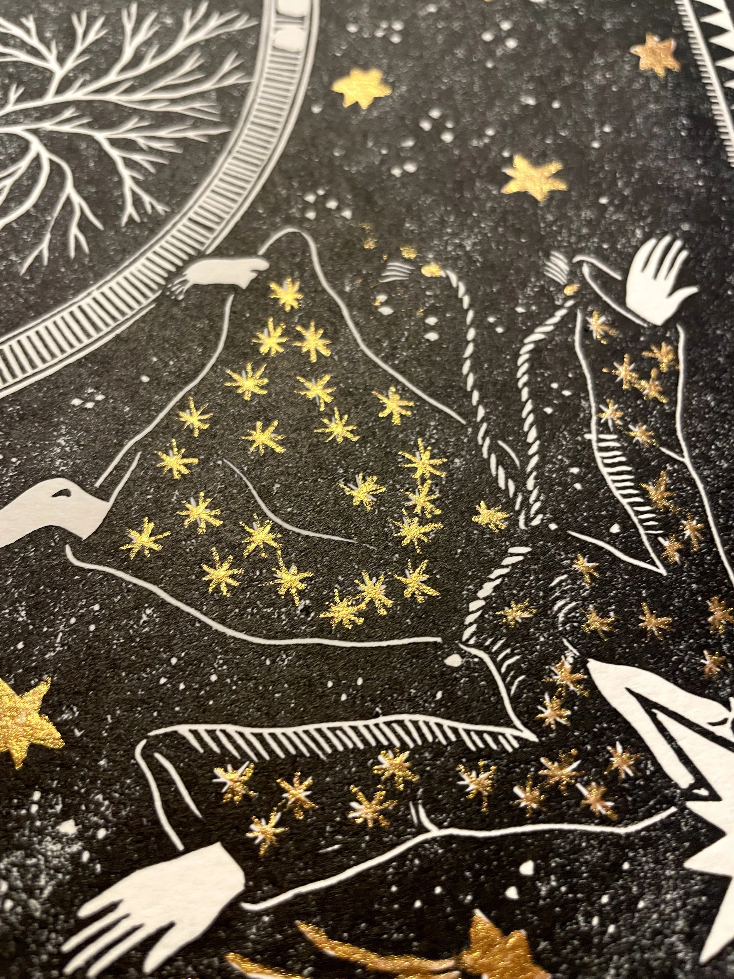 Printed with Cranfield Calligo Safewash Ink on Fabriano Unica 2590 gsm Crema paper with added gold watercolour details.