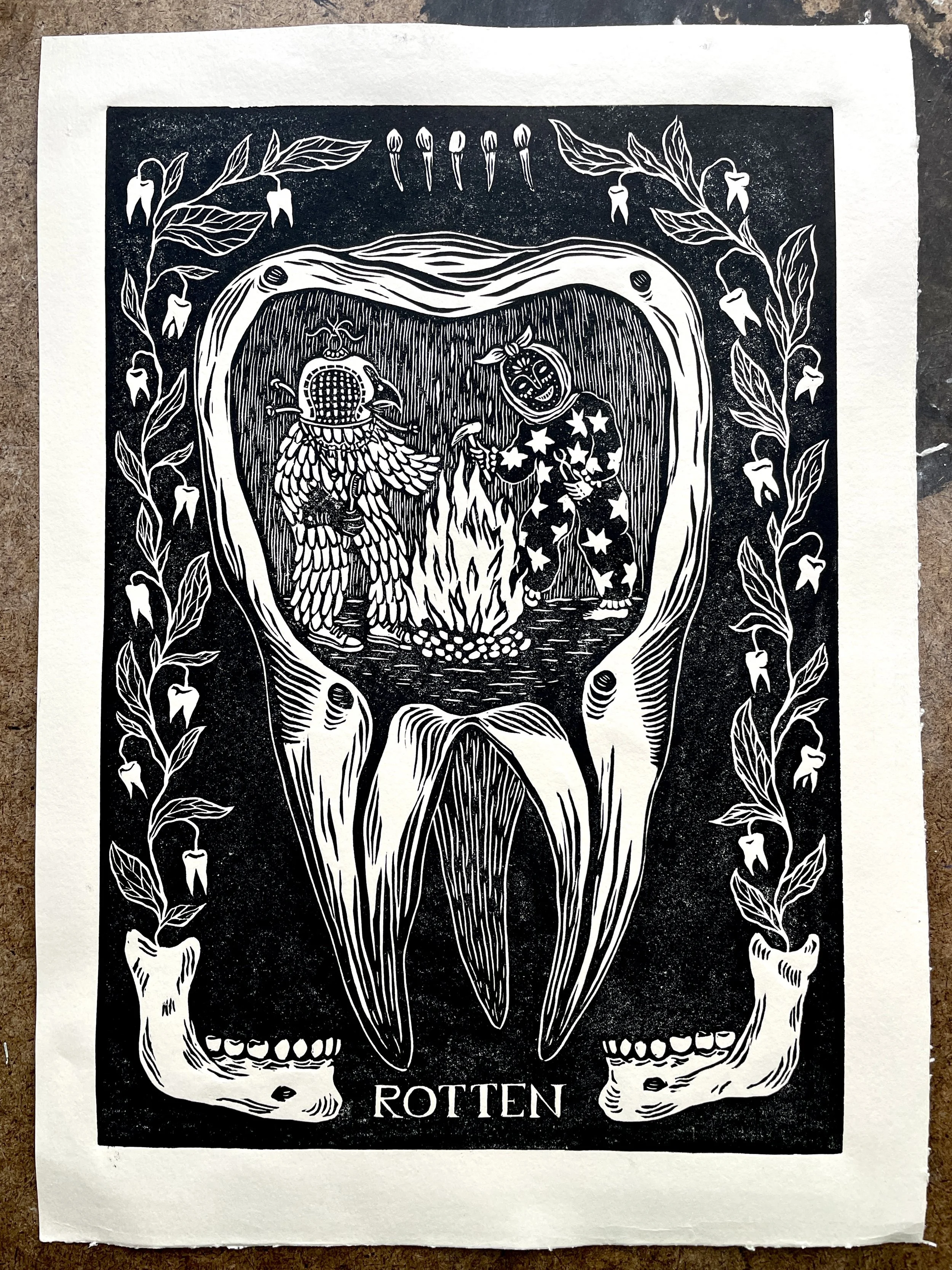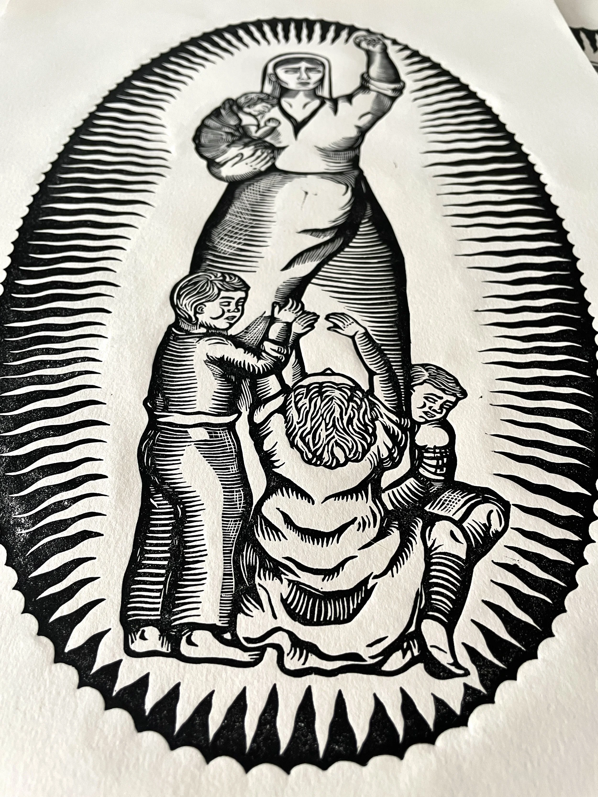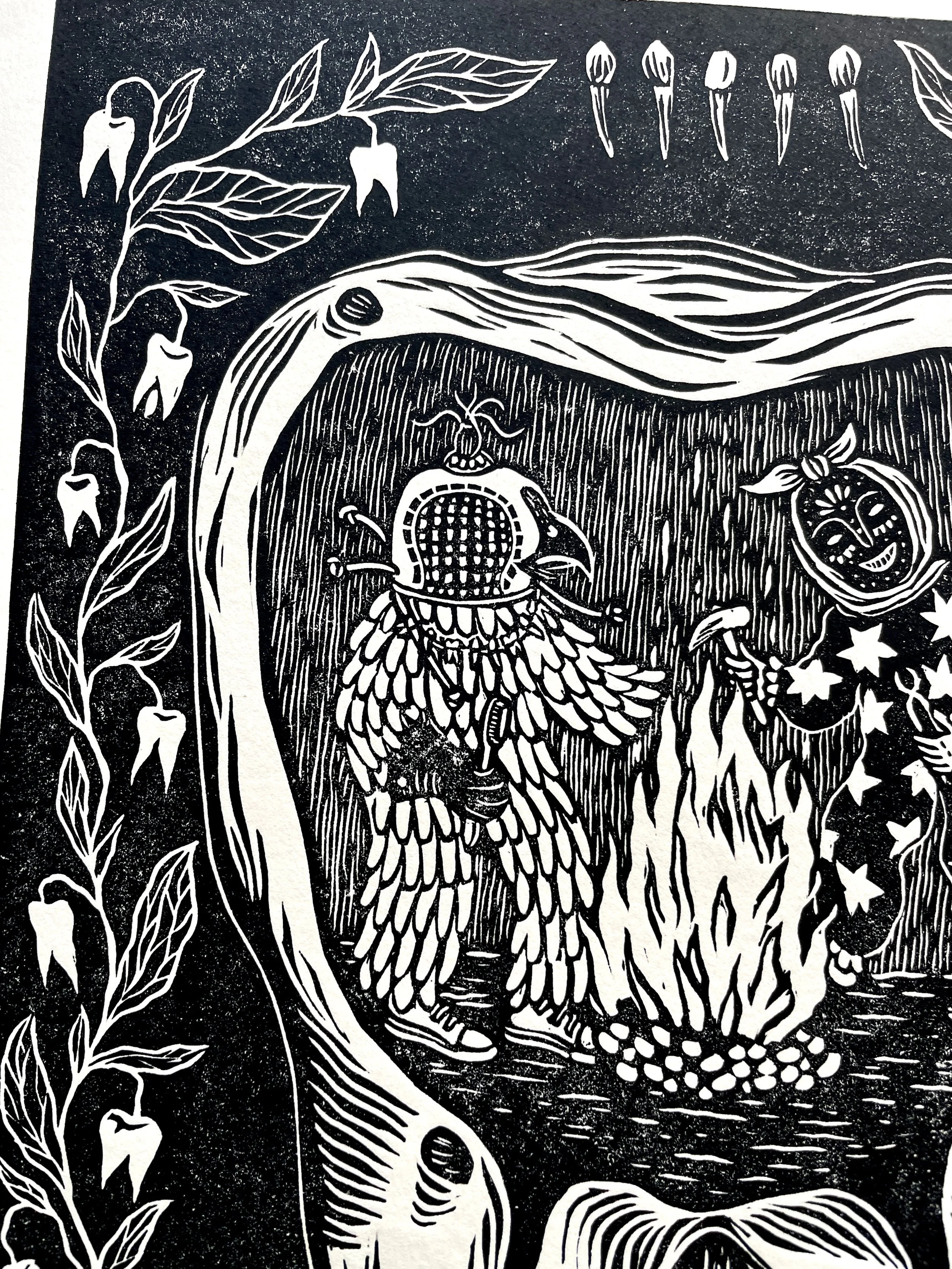 Printed with Cranfield Calligo Safewash Ink on Fabriano Unica 2590 gsm Crema paper with added gold watercolour details.