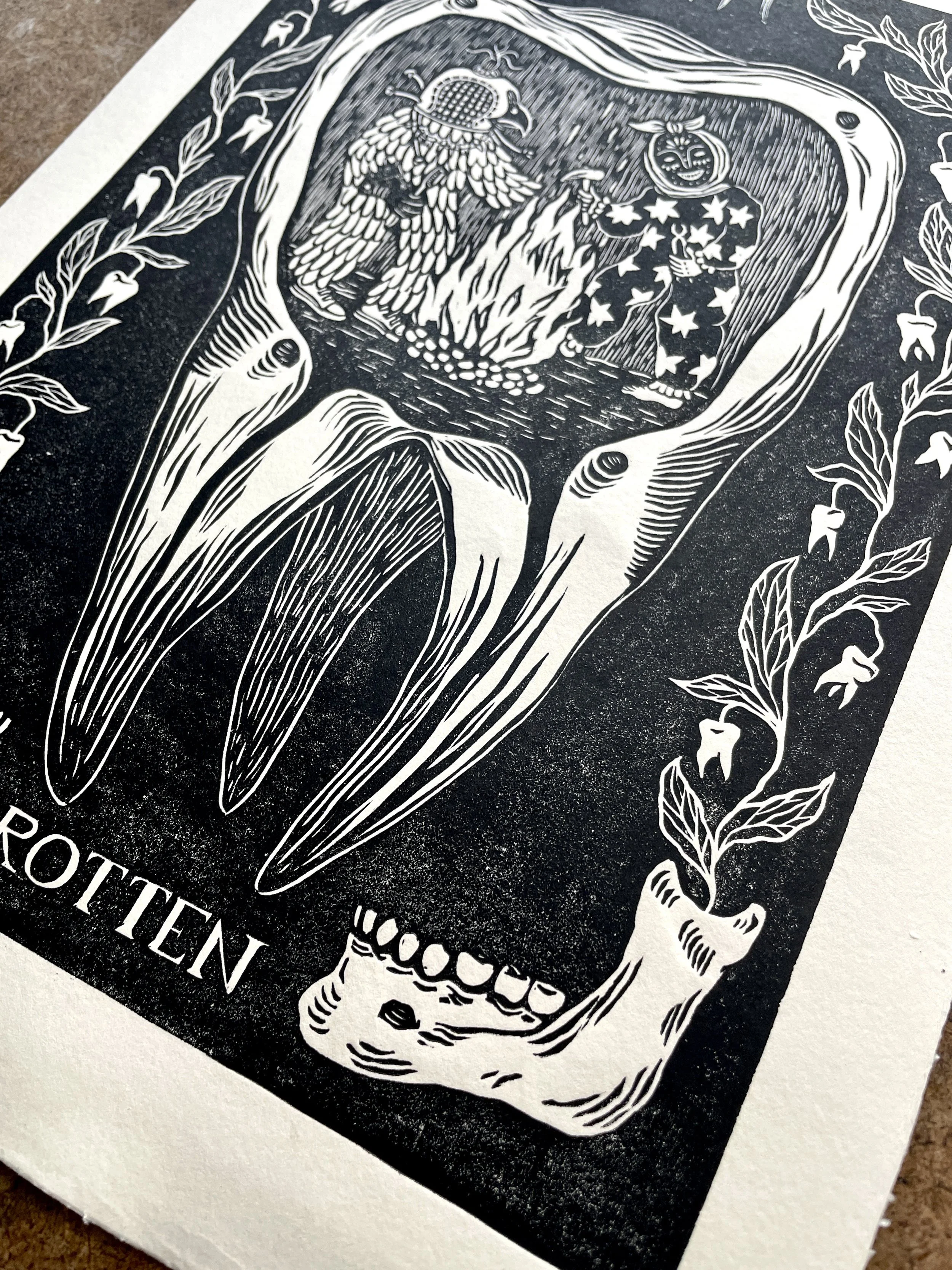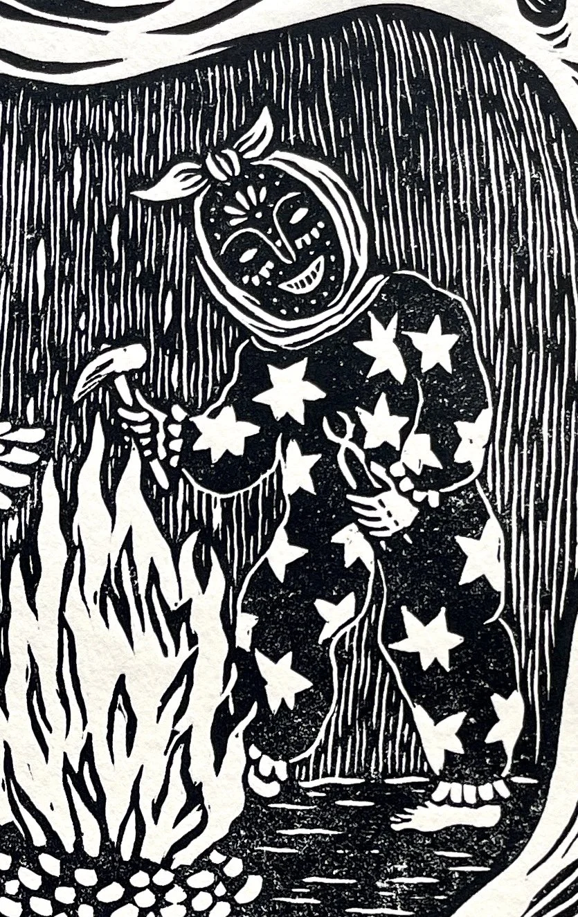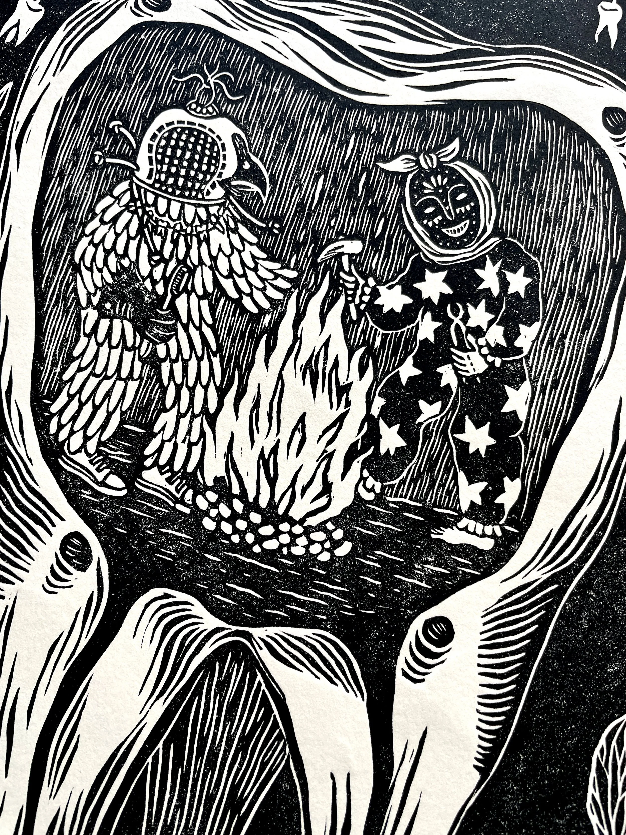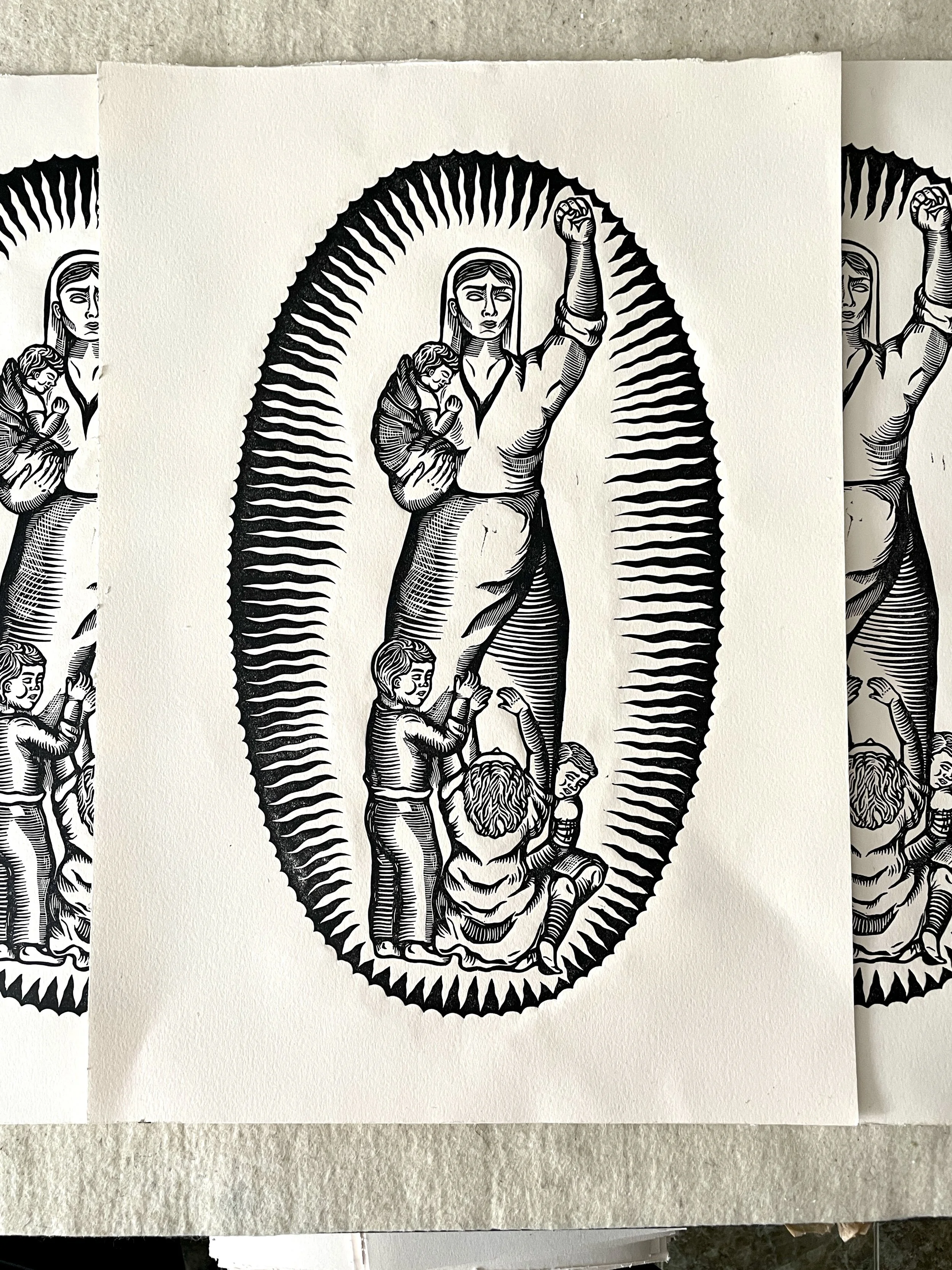 Printed with Cranfield Calligo Safewash Ink on Fabriano Unica 2590 gsm Crema paper with added gold watercolour details.