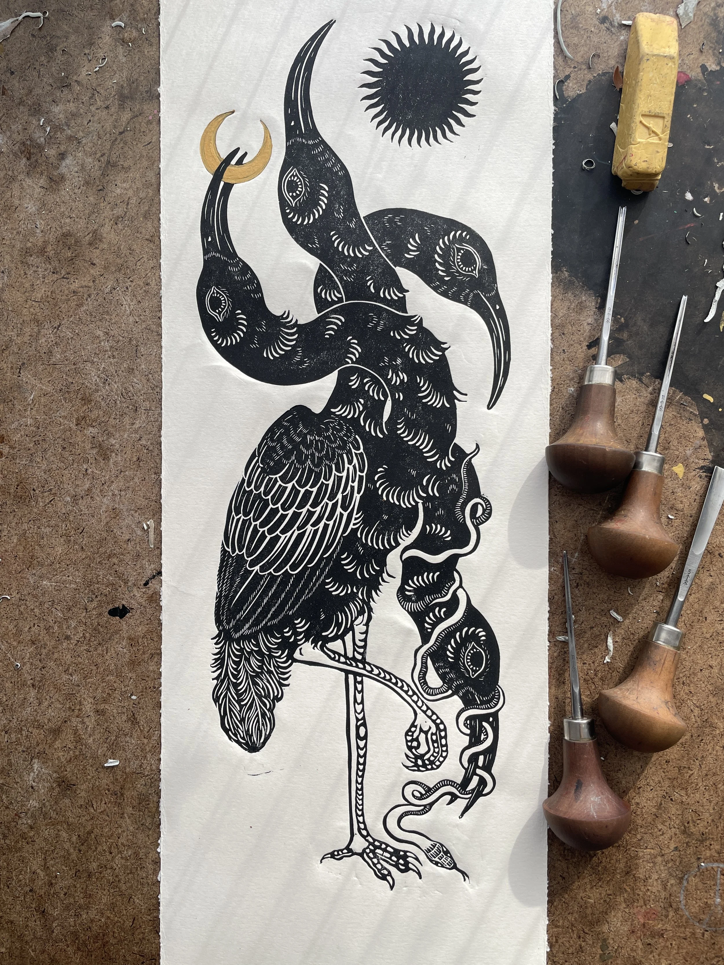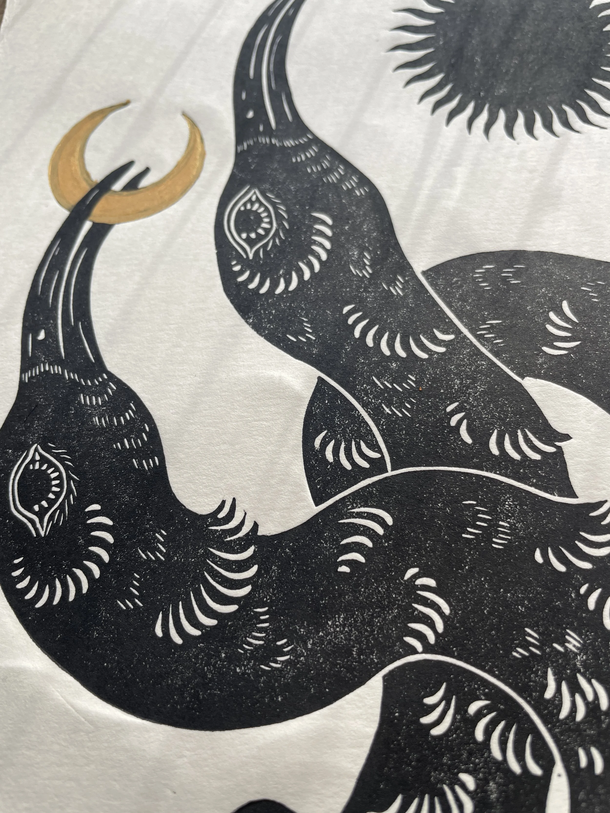 Anatomically inspired linocut print of the part of the brain that connects the left and right lobes. It is surrounded by Ligurian Emperor Moth (Saturnia pavoniella), florals and the Moon 🌙 with golden ink.