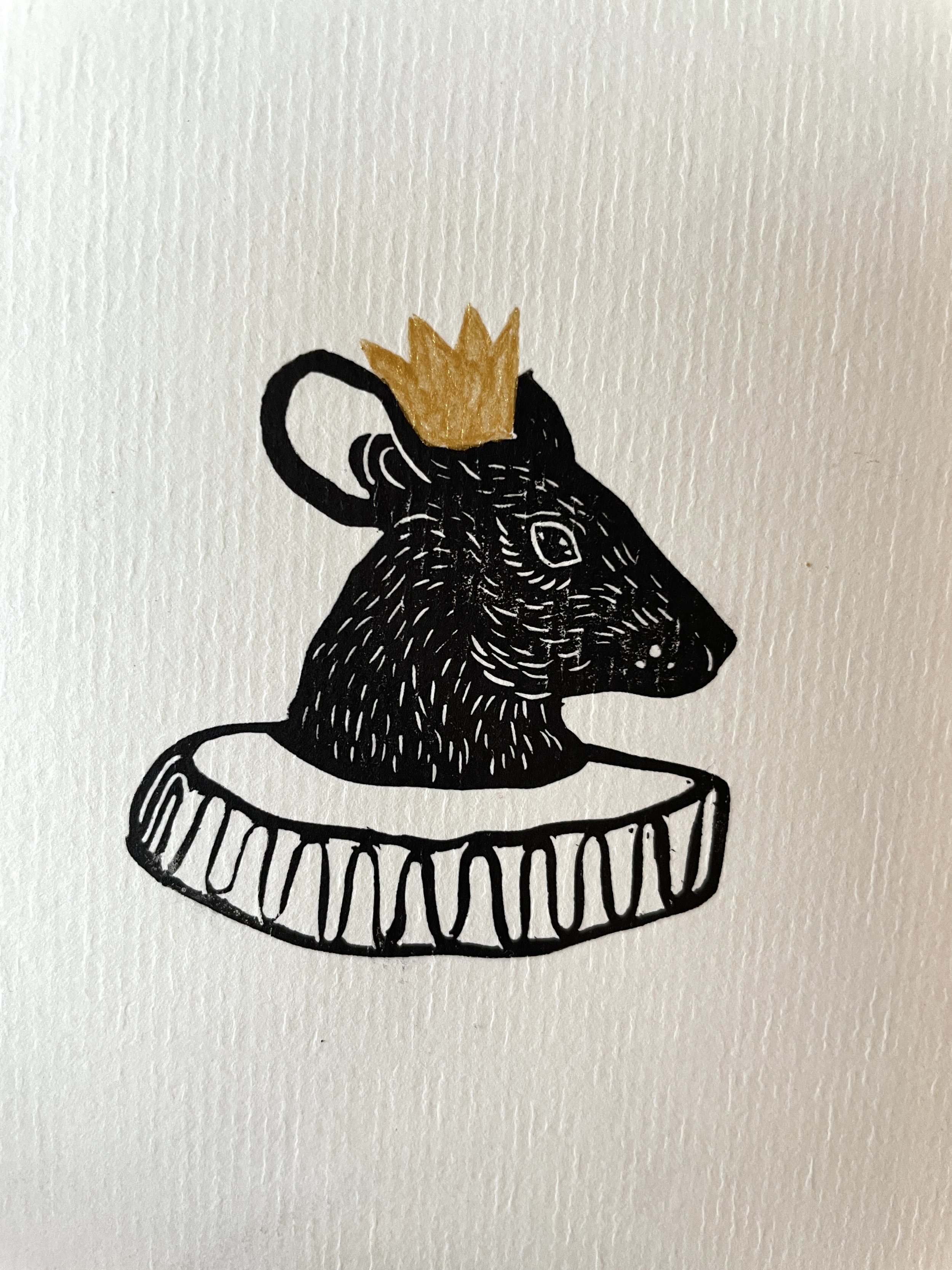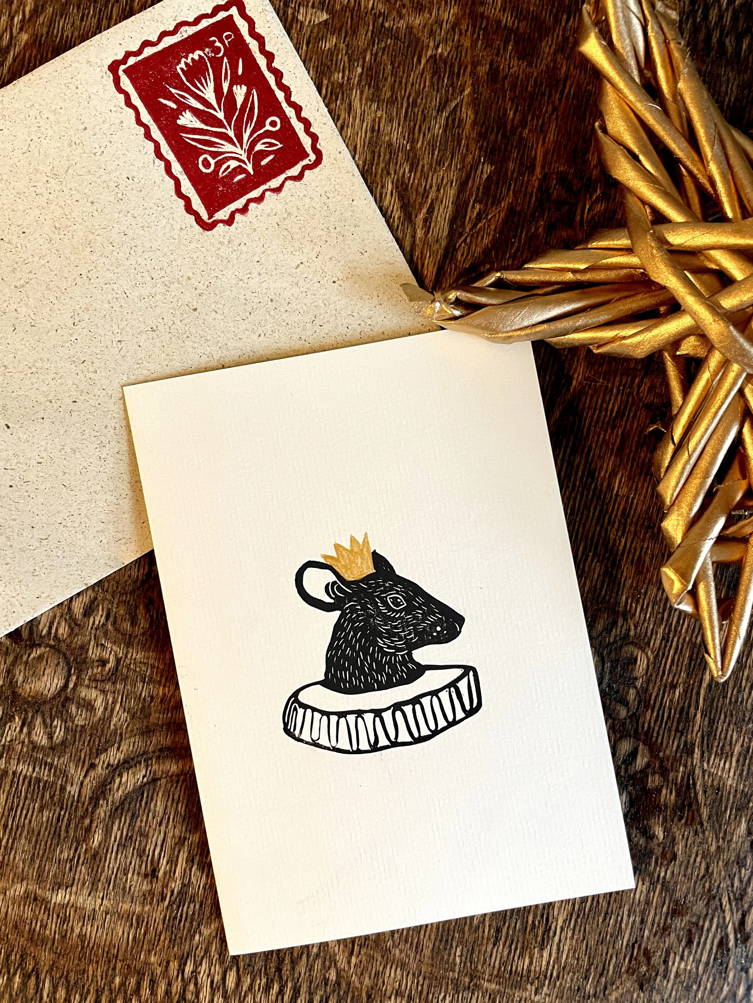 Handprinted linocut greeting card with recycled paper envelope and handprinted stamp.