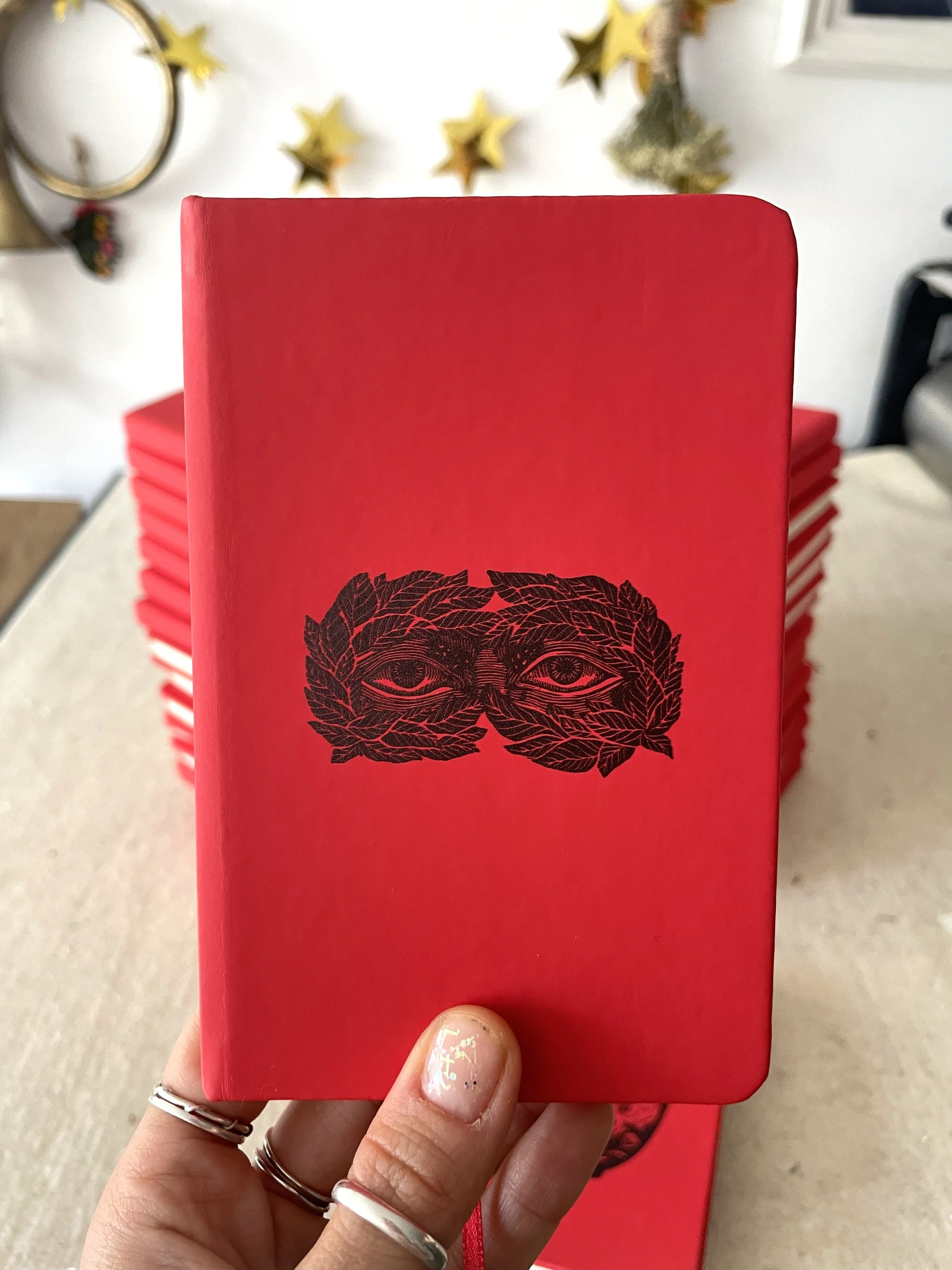 Black A6 Notebook with White Print of a Linocut Butterfly Ritual