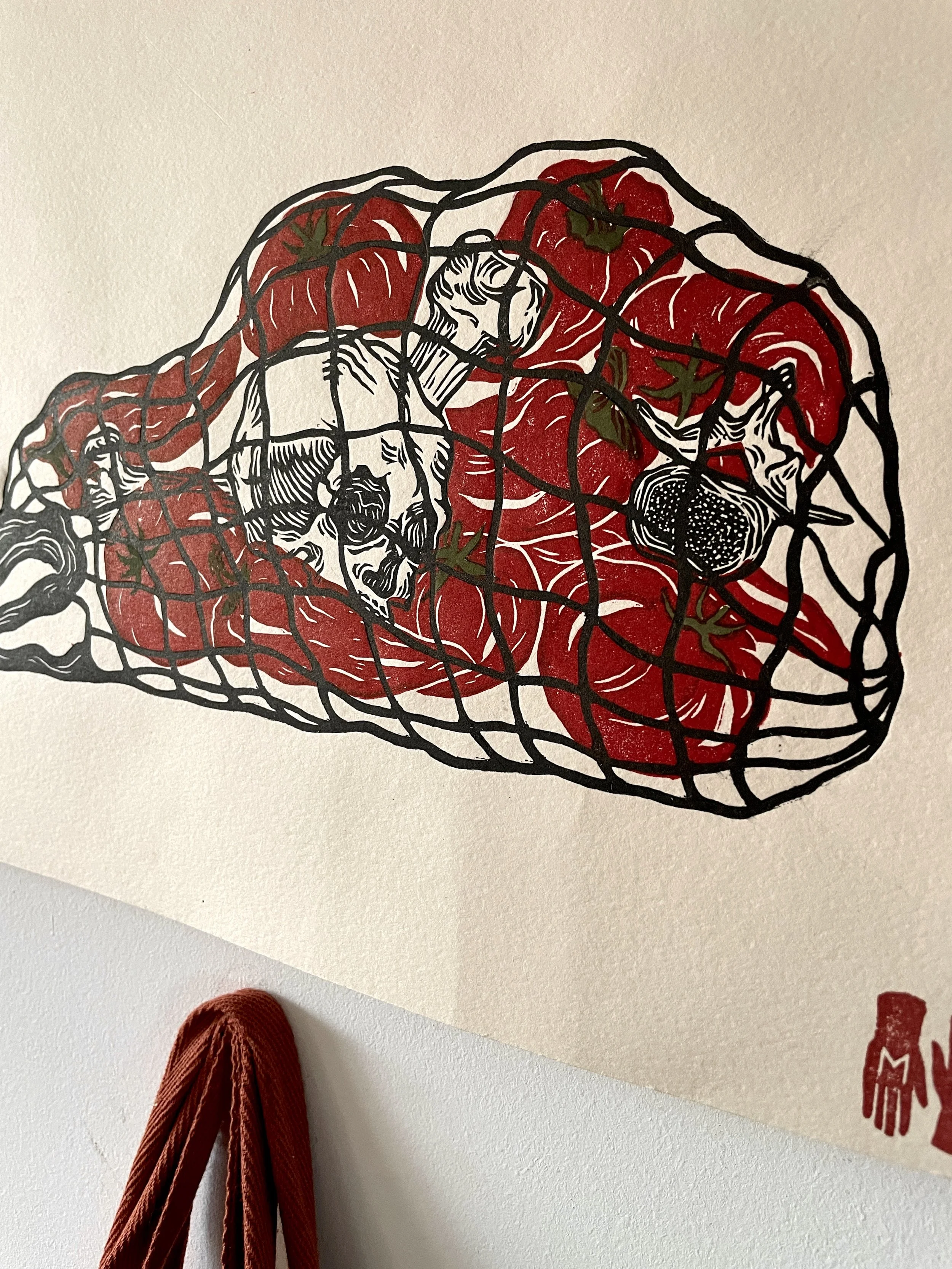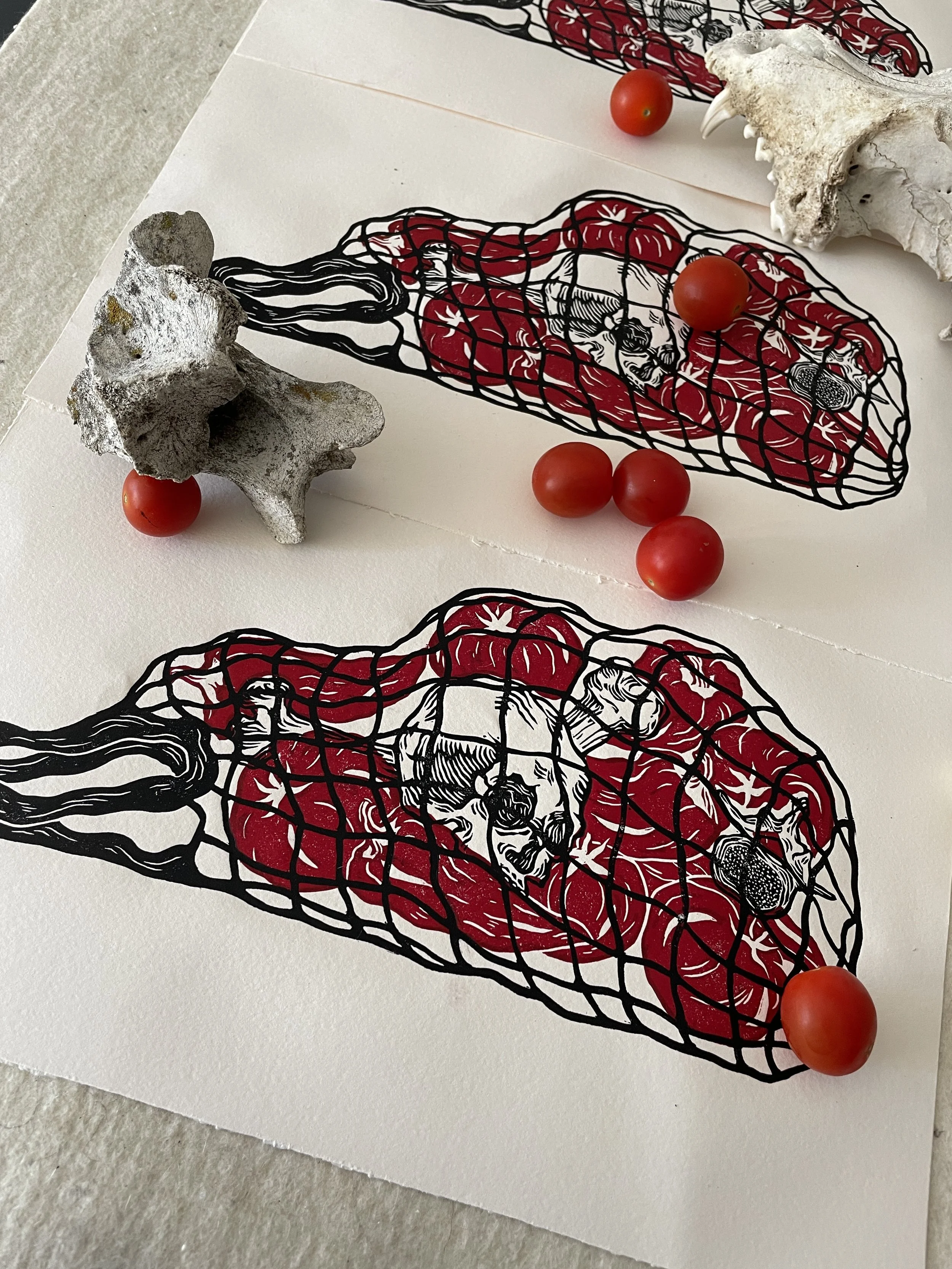 A linocut print inspired by the Ottoman empire’s understanding on a cavity and rotten teeth. tiny evil creatures having as party on your behalf in you tooth.