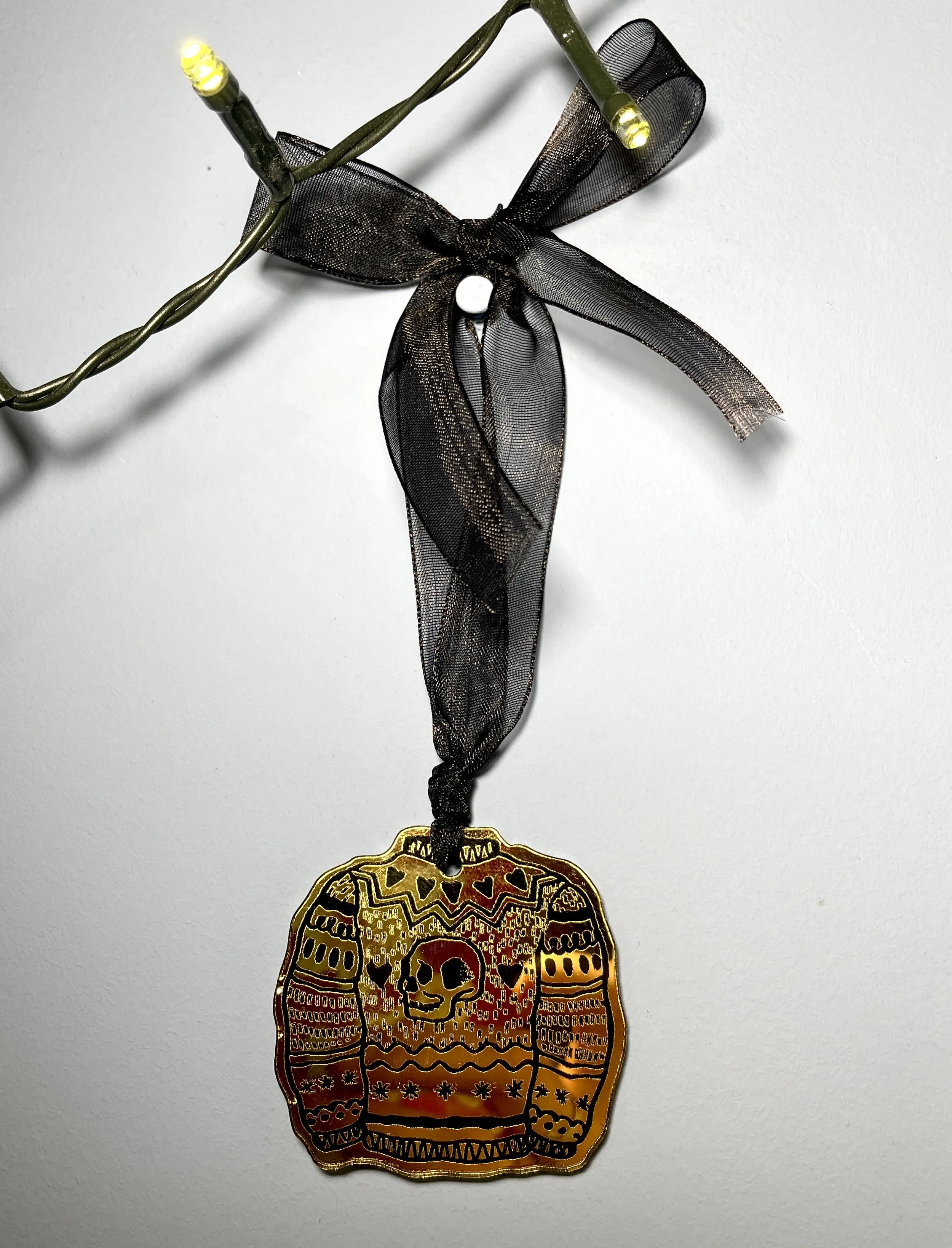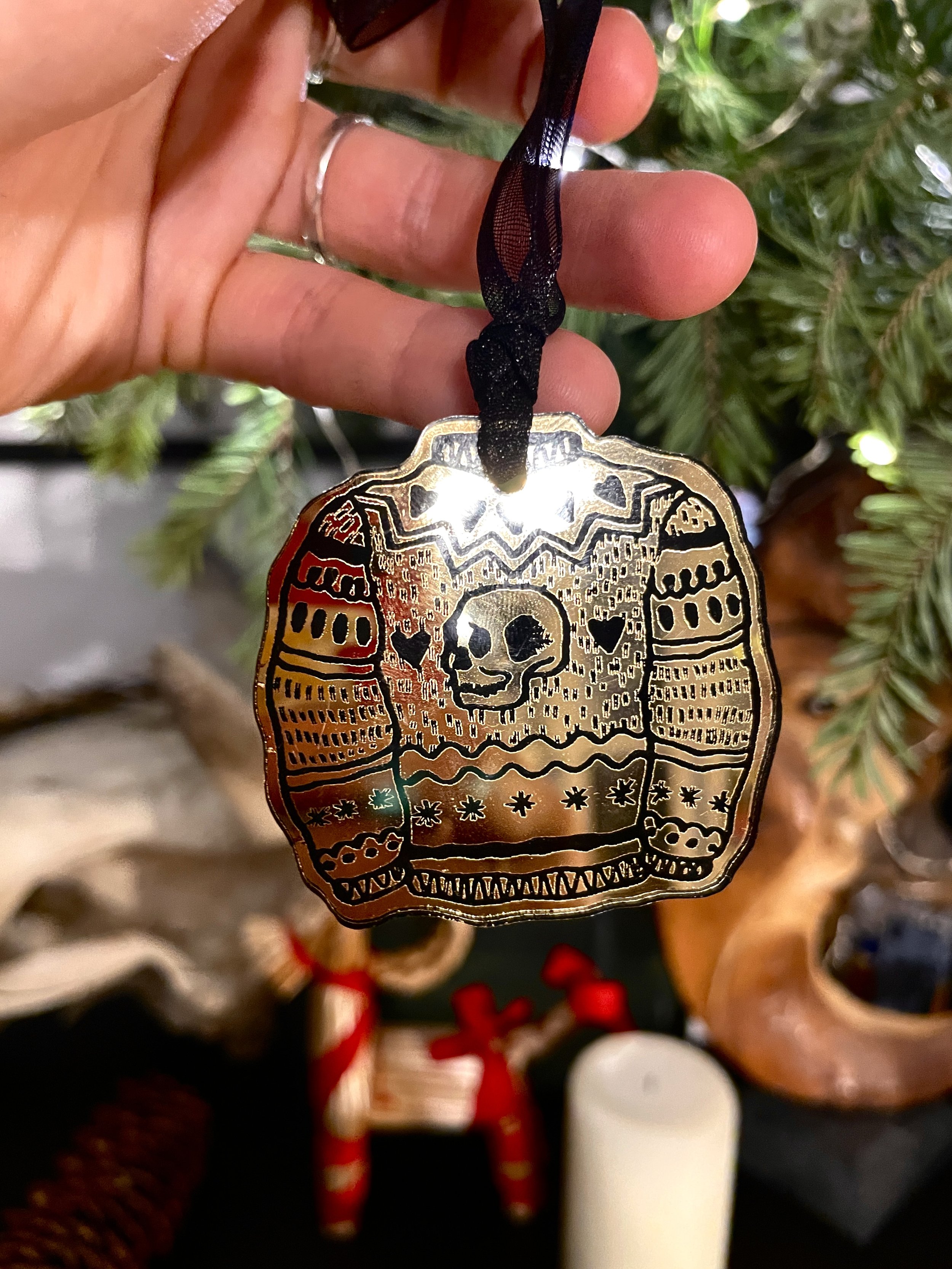 Acrylic ornaments with designs from my illustrations with ribbon.