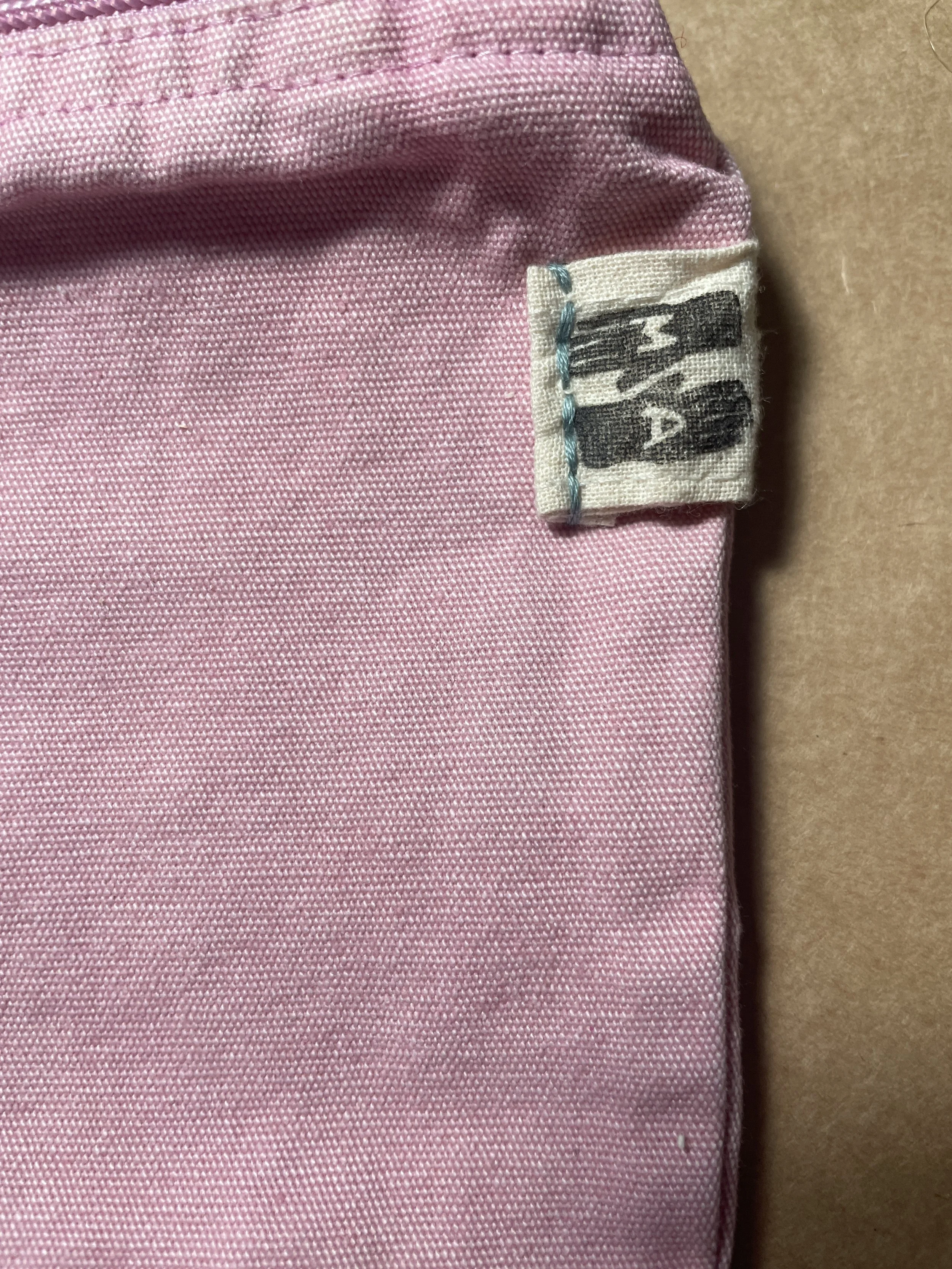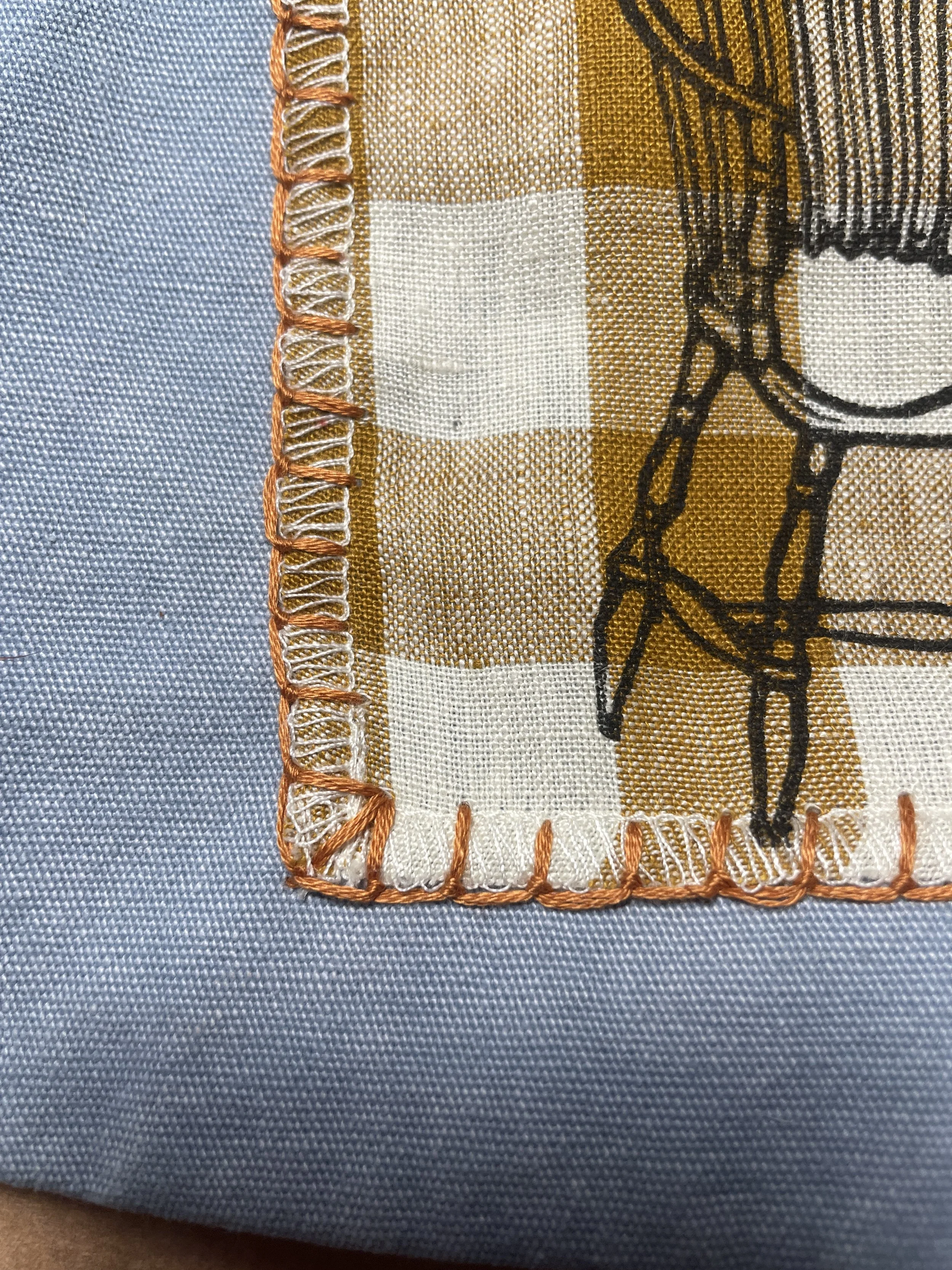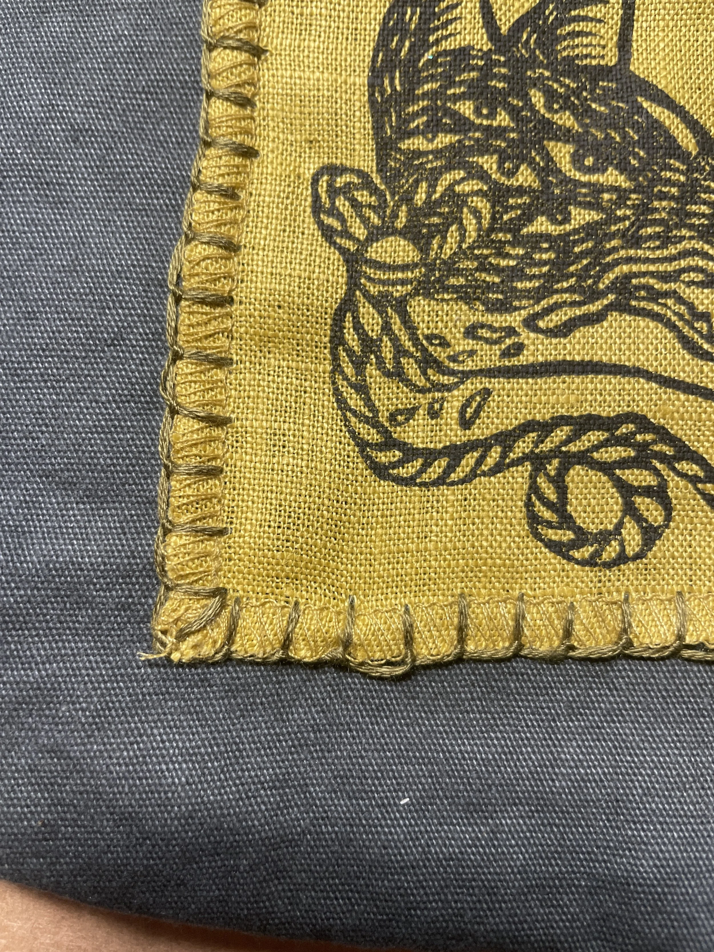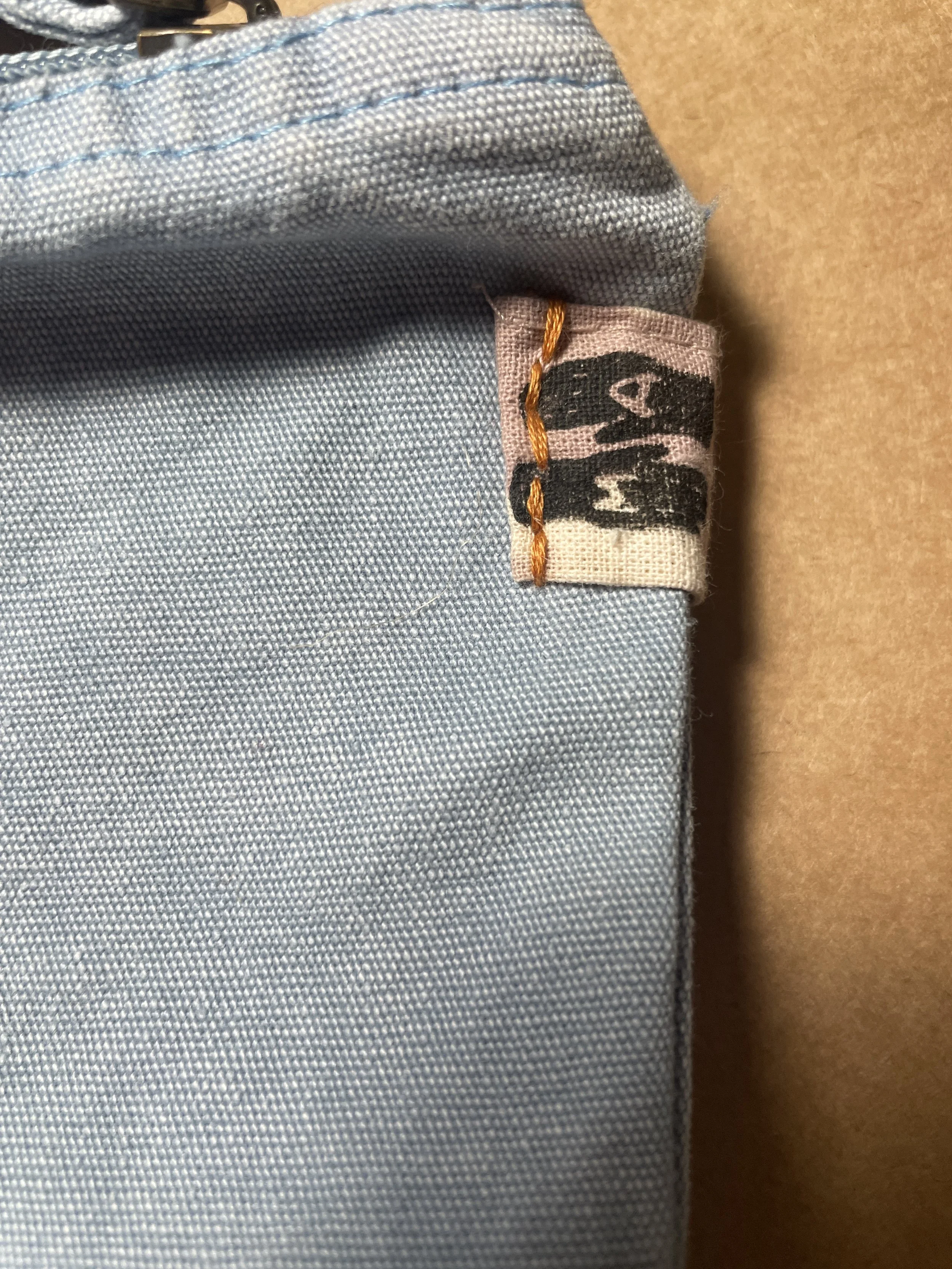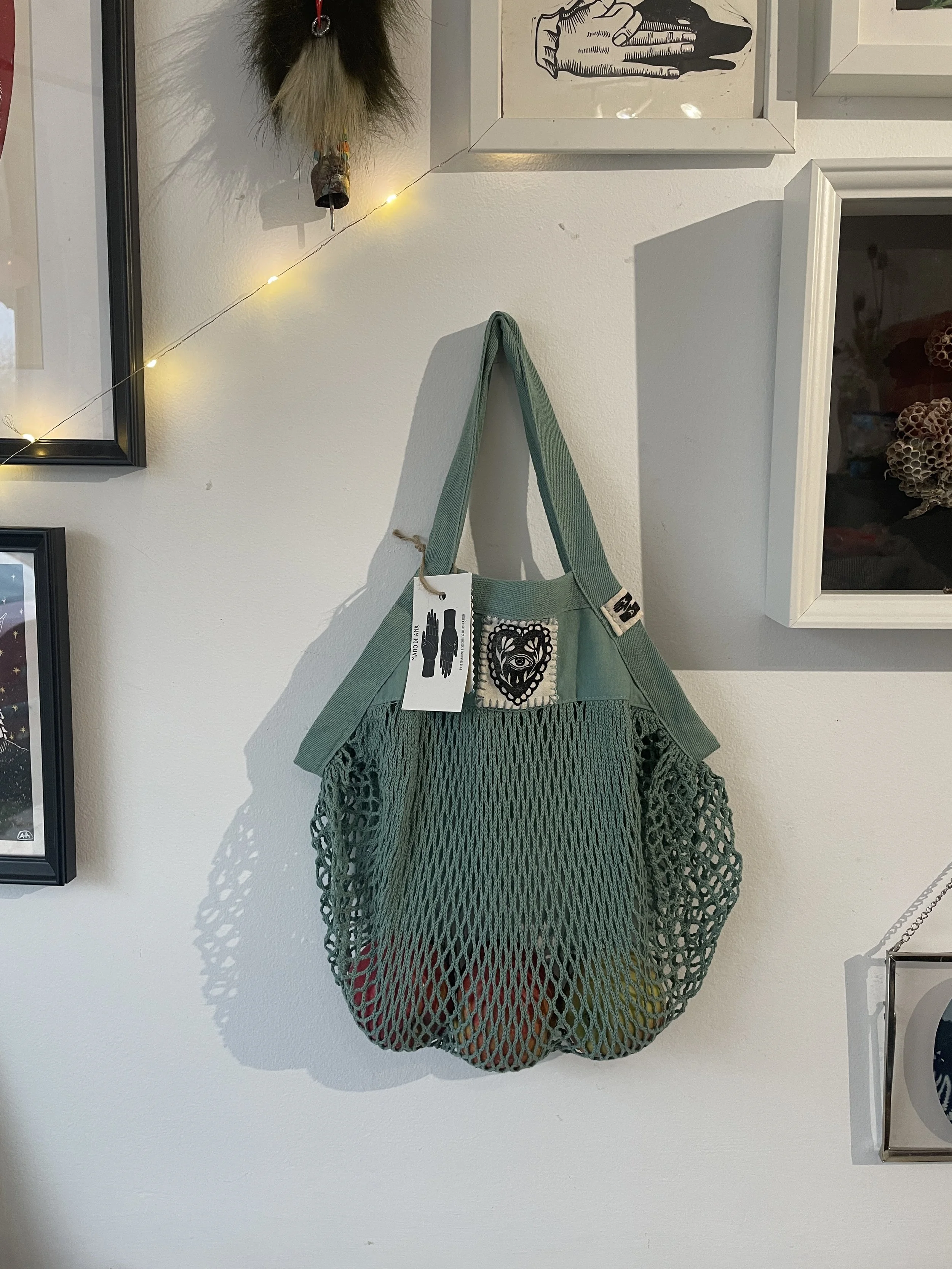 A cotton mesh tote bag in brick color with a leftover cotton fabric handprinted hand sewn linocut patch and a hand sewn diy hand printed tag for all your essentials or your nature-friendly groceries.